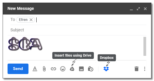 Al iniciar la redacción de un nuevo correo, aparecerá en la parte inferior un icono de Dropbox desde el cual se puede acceder al directorio de la cuenta de Dropbox, previa configuración inicial para su uso. Como se puede ver en la imagen también aparece la misma opción utilizando el servicio de Google Drive.