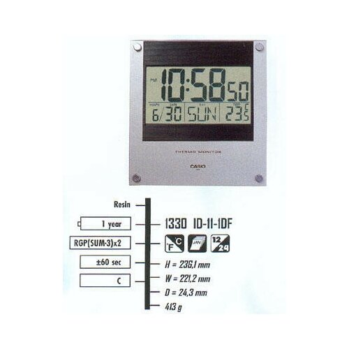 Casio ID-11S-1 – takvimli ve dahili elektronik termometreli kuvars duvar saati. Şık ve modern tasarımları, ister yatak odası ister çalışma odası olsun, herhangi bir odanın içini mükemmel bir şekilde tamamlayacaktır. Ürün gövdesi yüksek mukavemetli plastikten yapılmıştır. Dış etkenlere karşı oldukça dayanıklıdır, uzun süreli kullanımlarda rengini ve görselliğini kaybetmez.Casio ID-11S-1 – takvimli ve dahili elektronik termometreli kuvars duvar saati. Şık ve modern tasarımları, ister yatak odası ister çalışma odası olsun, herhangi bir odanın içini mükemmel bir şekilde tamamlayacaktır. Ürün gövdesi yüksek mukavemetli plastikten yapılmıştır. Dış etkenlere karşı oldukça dayanıklıdır, uzun süreli kullanımlarda rengini ve görselliğini kaybetmez.