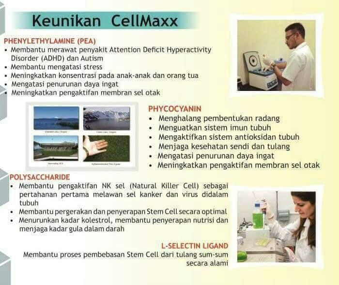 Bahan baku CellMaxx adalah Algae jenis AFA (Aphanizomenon Flos Aquae), diambil dari danau air tawar Klamat Lake di Utara Benua Amerika. Algae jenis AFA merupakan satu-satunya jenis ALGAE di dunia yang mengandung NUTRISI Paling LENGKAP – jauh di atas algae jenis lainnya.