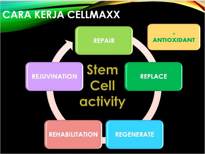 Selanjutnya CellMaxx mengaktifkan StemCell yang ada dalam tubuh manusia - kemudian StemCell bekerja meRePAIR (memperbaiki) organ tubuh yang sakit; sel mati pada organ tubuh yang sakit diganti dengan sel baru yang sehat dari StemCell.