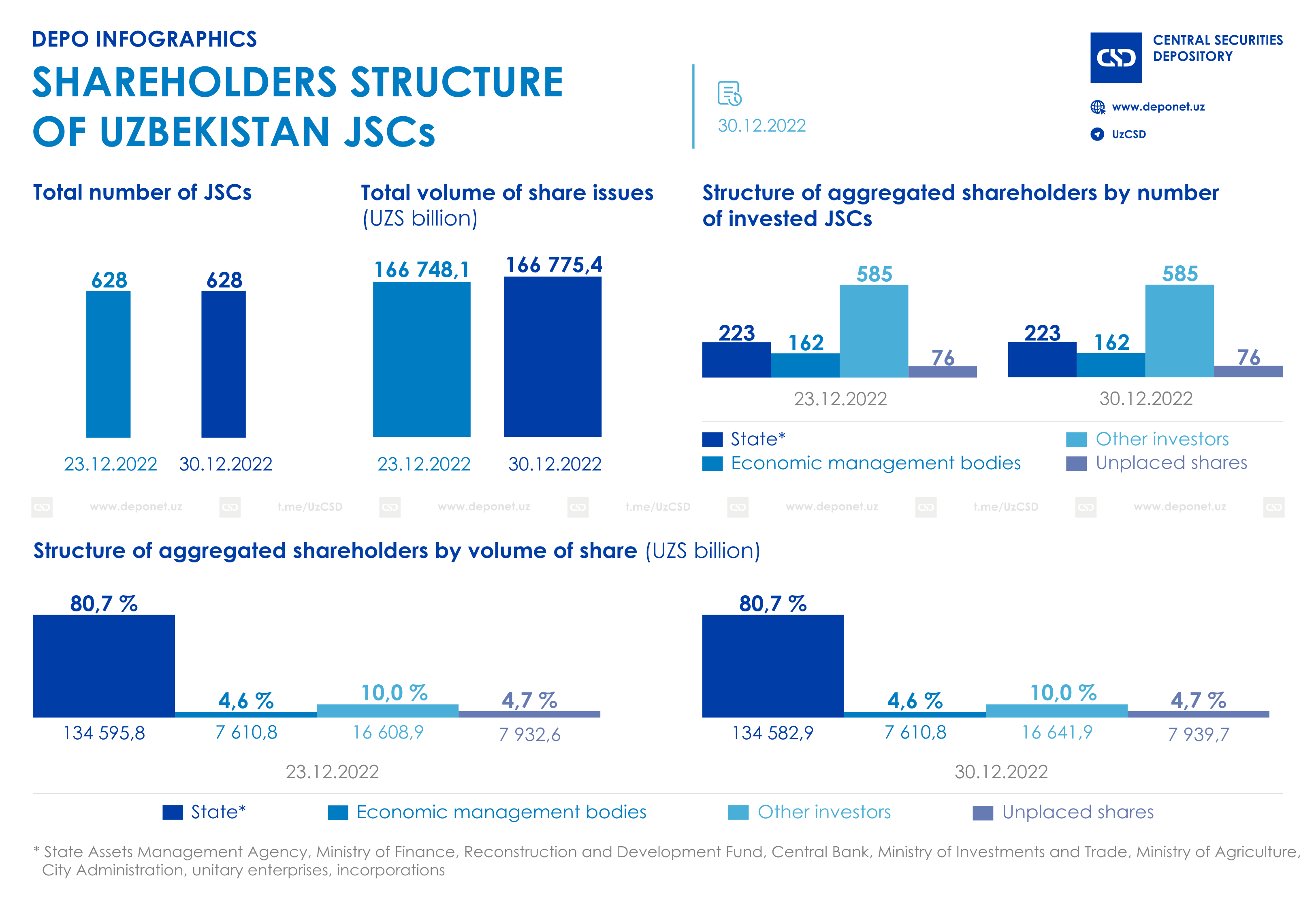The number of JSCs totaled 628 and the aggregate volume of shares issues totaled UZS 166 775.4 as of 30.12.2022.