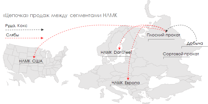 На зарубежные активы НЛМК продает слябы (стальные заготовки) на свои предприятия в США и в Европе для дальнейшего проката и продажи на рынках присутствия