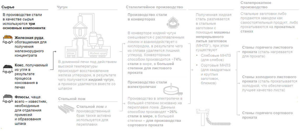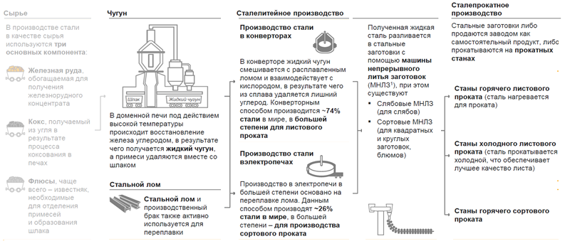 Как видно, готовая сталь является результатом далеко не одного производственного процесса. Именно поэтому крупные сталевары являются вертикально-интегрированными компаниями (захват одной компанией нескольких или всех этапов производства) в целях контроля качества и оптимизации издержек на каждом этапе производственной цепочки.