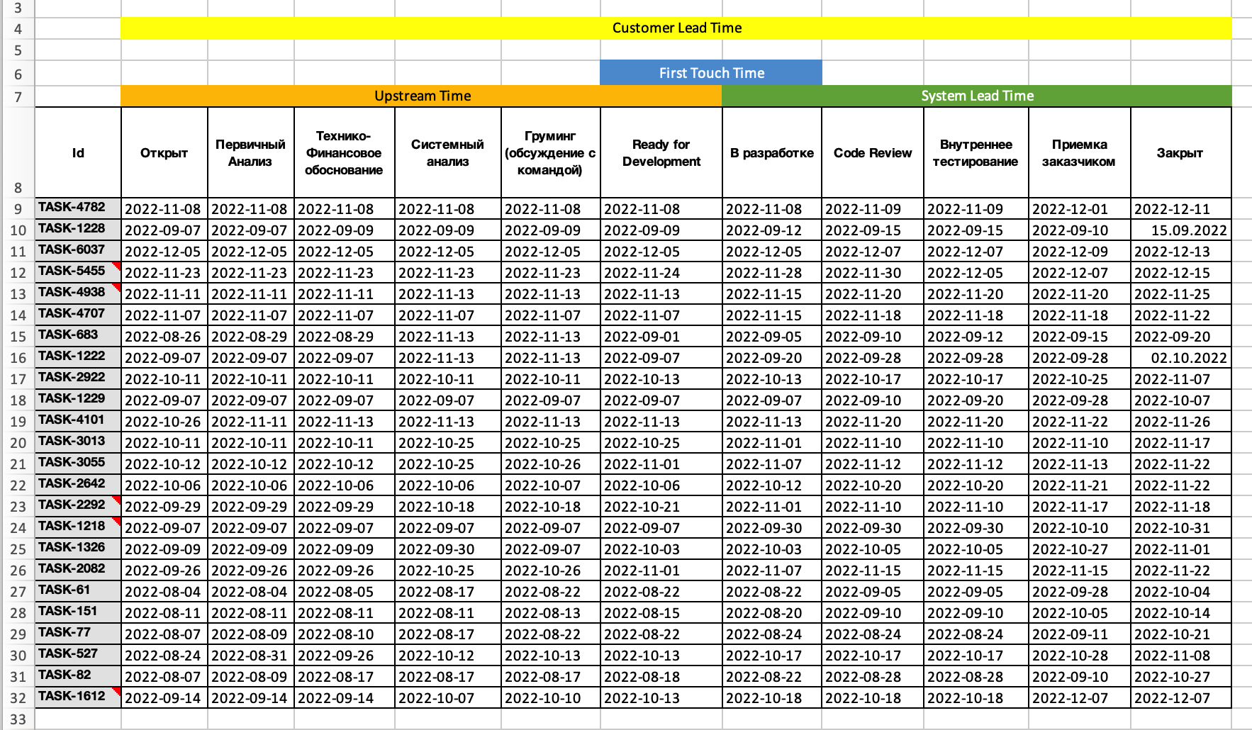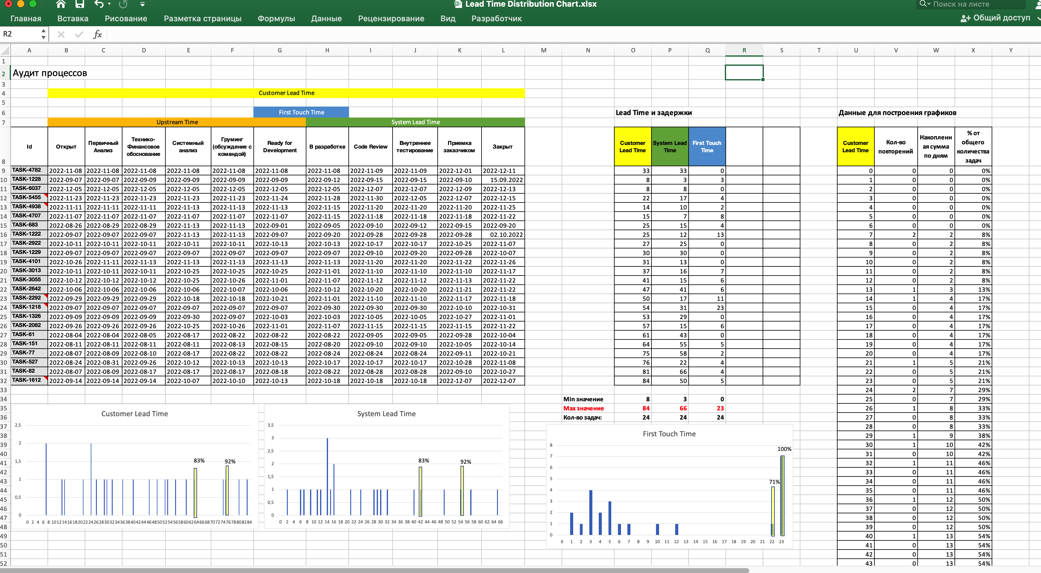И вот на основе этих данных составляем аналитику, строим Lead Time Distribution Chart по разным частям Value Stream и получаем разные метрики: Customer Lead Time, Upstream Lead Time, First Touch Time, System Lead TIme.