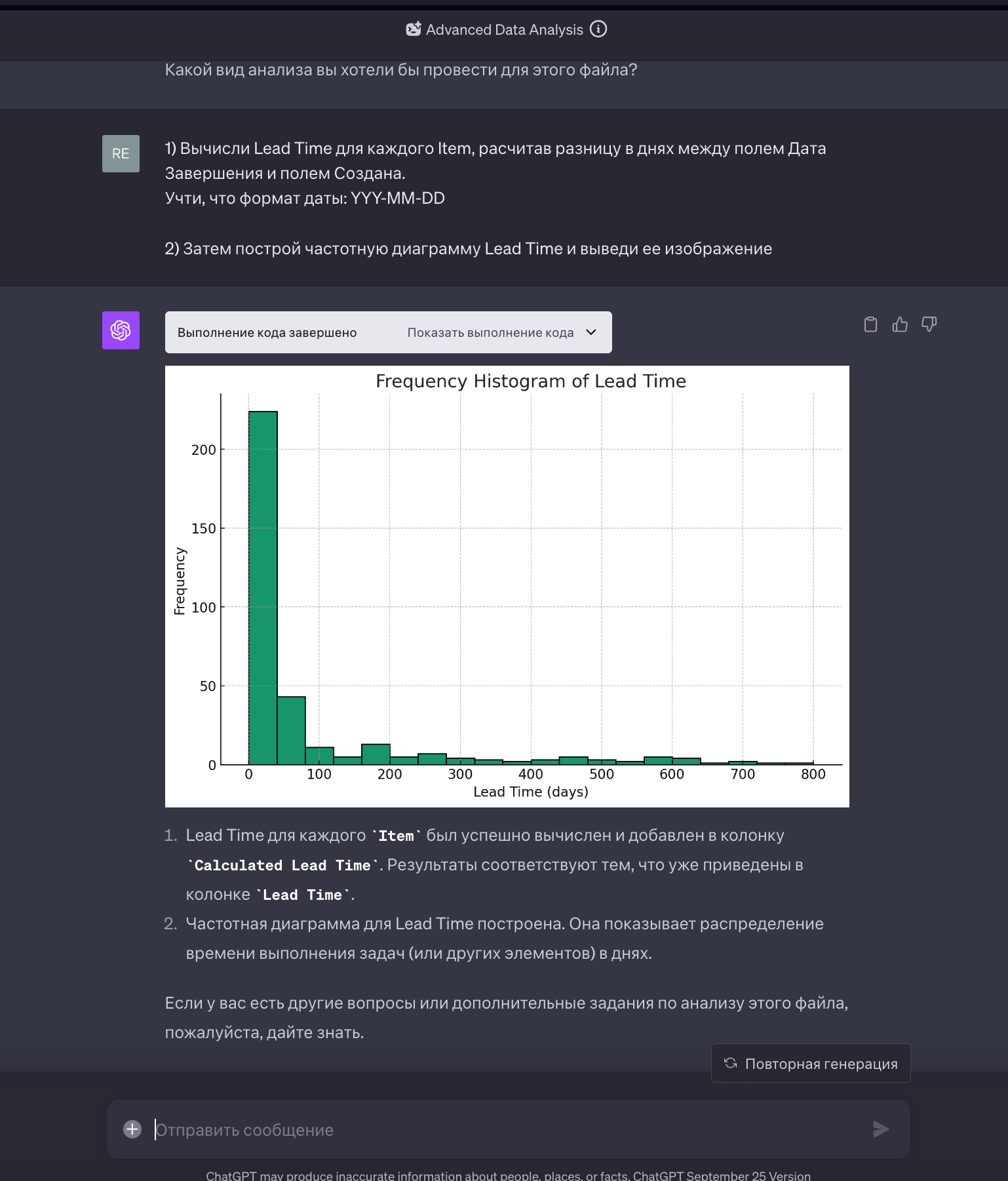 Плагин позволяет загрузить файл с данными и по запросу пишет python-код с использованием библиотеки pandas для анализа данных. Потом сам его выполняет и выводит готовый результат. Это может сильно сократить время на превращение “сырых” данных в таблицу для построения Lead Time Distribution Chart.