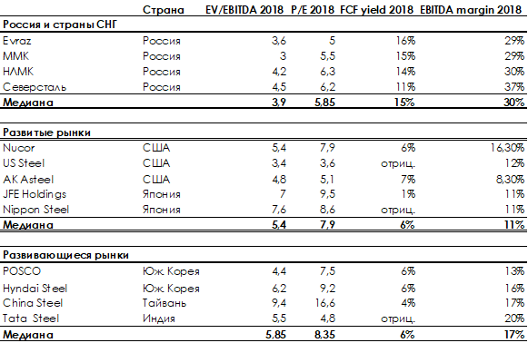 Недооценка наших сталеваров видна из таблицы. Медианный мультипликатор EV/EBITDA за 2018 по российскому рынку был на уровне 3,9х, аналогичный мультипликатор по развитым и развивающимся рынкам составил 5,4х и 5,85х соответственно.