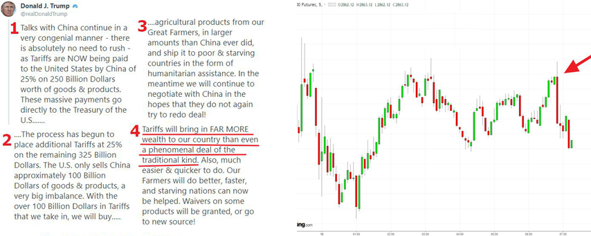 Чтобы вы понимали, как рынок реагирует на каждую новость о сделке, привожу в пример твитты Трампа и мгновенную реакцию американского рынка. Как видно, торговая война никому не нужна.