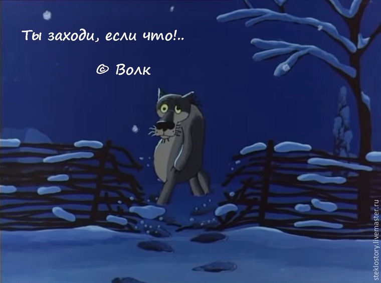 заходи если че . синие тона . рисунок . снежная погода . знаменитый волк . оперся о буквы . черно-белый текст . ностальгия . из советского мультфильма . красный волк . знакомое выражение . анимация . шо опять? ты заходи если что .