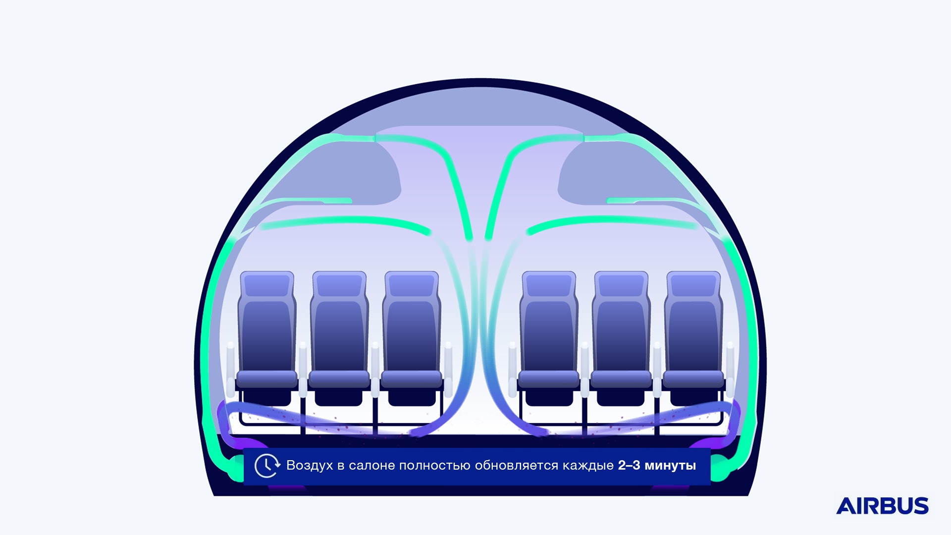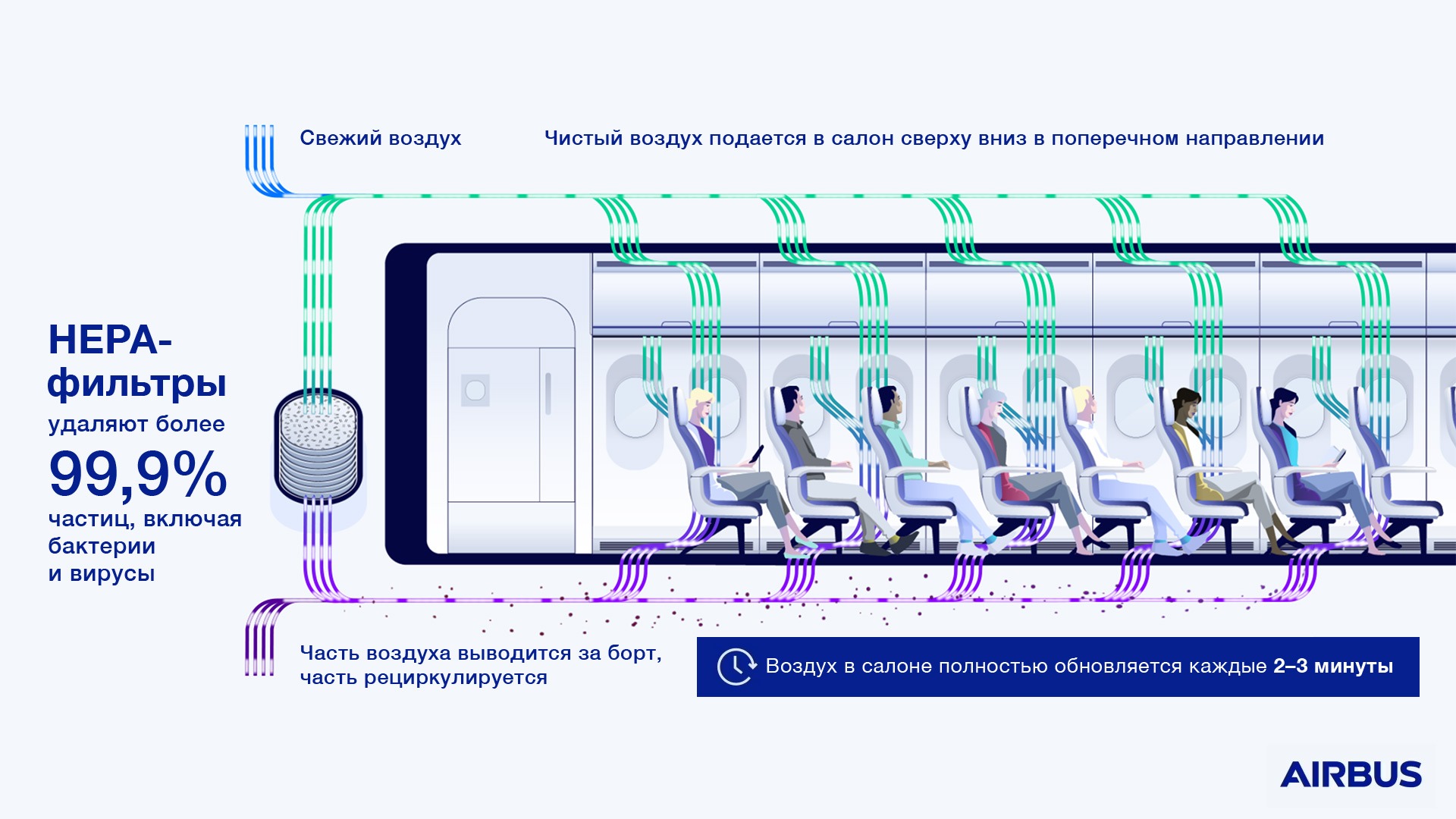 Это далеко от истины. Воздух в салоне самолетов Airbus полностью обновляется каждые 2-3 минуты. Именно так работает система кондиционирования, которая постоянно смешивает свежий воздух с рециркулируемым в пропорции 50% на 50%. Каждые две-три минуты часть использованного воздуха выводится из самолета, часть отправляется на повторную очистку и рециркуляцию в систему кондиционирования, после чего она опять смешивается со свежим воздухом и подается в салон. Для сравнения, в офисных помещениях замещение воздуха происходит каждые 20 минут, так что пассажиры самолета дышат гораздо более чистым и свежим воздухом, чем офисные сотрудники бизнес-центра.