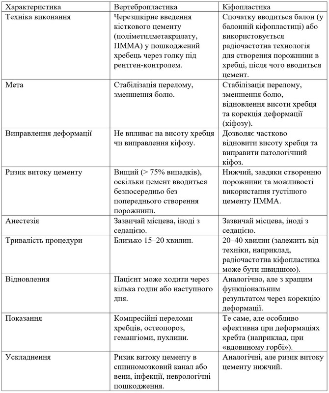 Обидві процедури ефективні для стабілізації переломів хребців та зменшення болю, але кіфопластика має значні переваги завдяки можливості відновлення висоти хребця, корекції деформації та зниженню ризику витоку цементу. Вона вважається вдосконаленою версією вертебропластики, особливо для пацієнтів із виражено деформованим хребтом або остеопорозом. Вибір між цими методами залежить від клінічної ситуації, стану пацієнта та рекомендацій нейрохірурга. 🩺