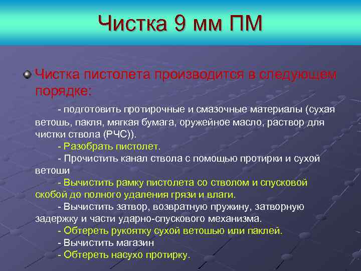 Чистка пистолета производится