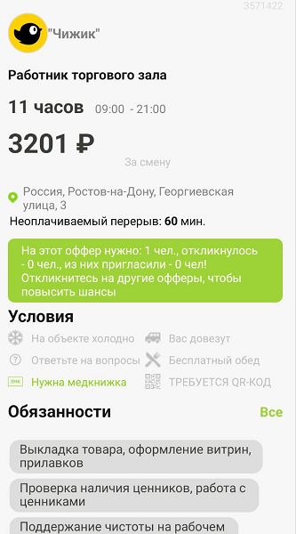 В карточке есть информация о том, сколько нужно человек на эту смену и сколько уже откликнулись. Смены в приложении есть на 5, 8 и 12 часов. Я взяла смену полную: на 12 часов с перерывом 1 час. Основная работа на точке - выкладка товара, в остальное время надо выравнивать первый ряд товаров для видимости покупателям и убирать с полок пустые упаковки. Все вопросы, связанные со сменой, можно задавать администратору магазина.