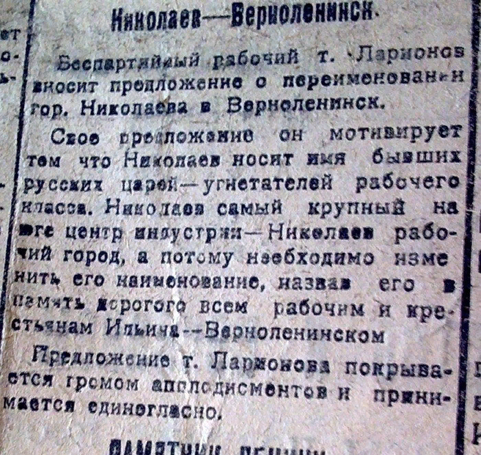 Ну тут всё понятно, индустриализация родила ещё кучу портов и судостроительных заводов, а культура и всё остальное отошли на второй план или в Одессу. В 30-х на волне хайпа чуть не переименовали Николаев в Верноленинск.