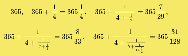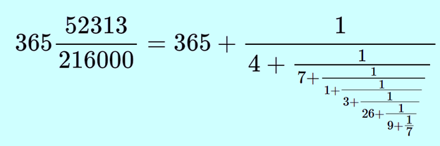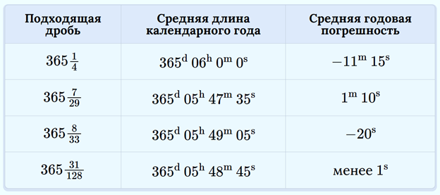 Числа, получаемые при «обрыве» цепной дроби, называют подходящими; они служат последовательными приближениями исходной дроби. Каждая из первых подходящих дробей даёт свой календарь: