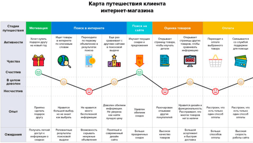 Наиболее распространенный формат customer journey map — это таблица. Ниже вы видите, как может выглядеть карта путешествия пользователя интернет-магазина. По вертикали прописаны стадии пути и действия потенциального клиента. По горизонтали указаны чувства, опыт и его ожидания. Такая CJM помогает понять путь клиента, его чувства, увидеть мотивы принятия решений, а также выявить слабые и сильные стороны компании.