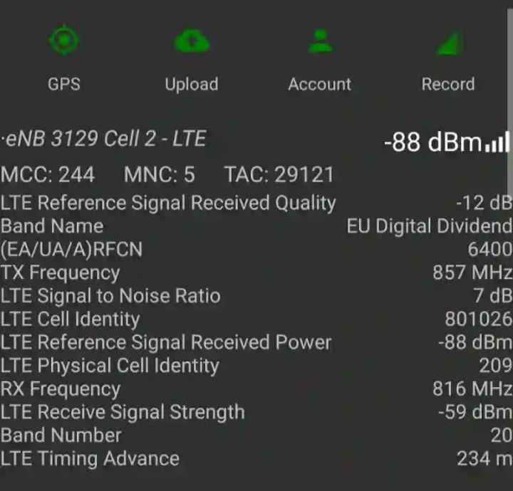 Verá en la siguiente figura la información que hay en un dispositivo Android. Depende de la compatibilidad de su teléfono con lo que vea en la pantalla, a partir de Android 7+, la mayoría de los teléfonos también admiten la grabación de banda. Todos los Windows 10 Mobile también admiten la grabación de bandas. Para ello lo puedes encontrar en el menú principal del lado izquierdo donde hay que tener en cuenta los iconos de color verde (el ícono de cuenta está en rojo por dos motivos, o no has creado una cuenta Cellmapper o no tienes Internet) pero nada de eso afectará que puedas mappear, los demás iconos si tienen que estar verdes.