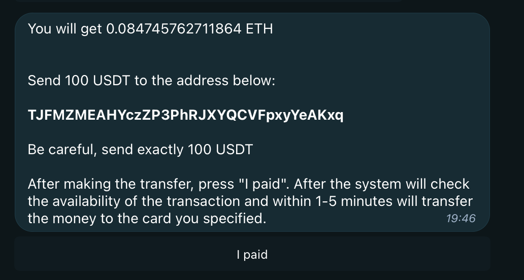 Doing transaction on wallet, press "I paid" and waiting for ETH arrival on your crypto exchange account.