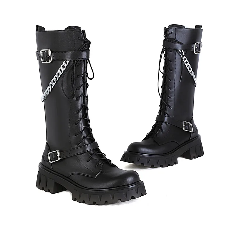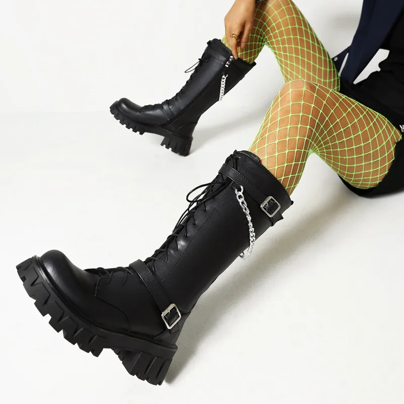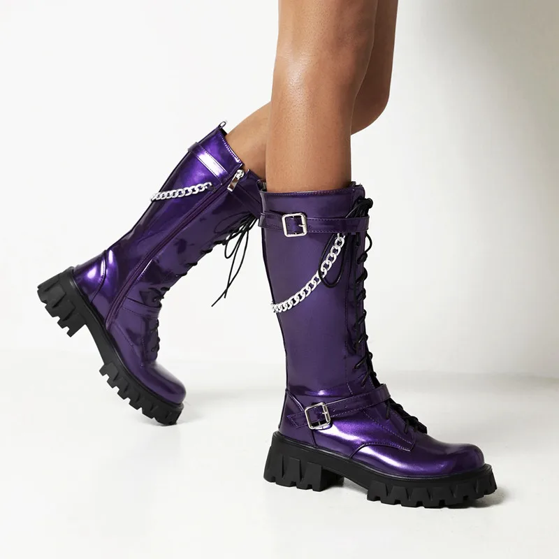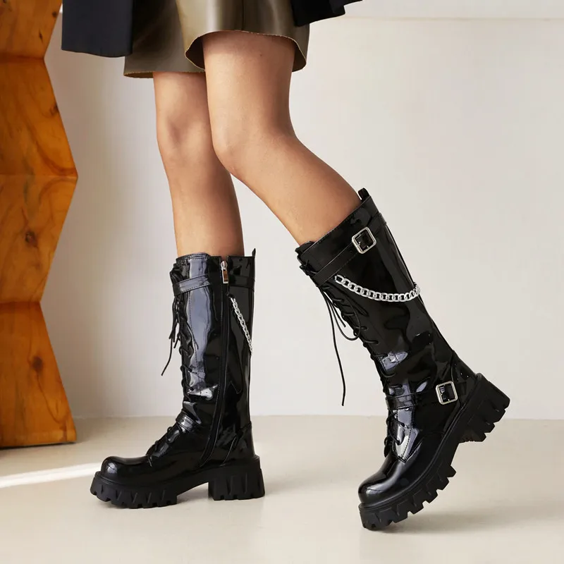 "CYJSYQFC Punk Gothic Style Chain Decor Flat Platform Women Mid Calf Boots Patent Leather Lace Up Zip High Heels Motorcycle Boots" * Buy Now Just For 53$