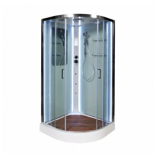 Marque : DetoPays : FinlandeDimensions (LxP) : 90x90 Forme de la cabine : quart de cercleL'installation de la cabine de douche s'effectue sans utilisation de silicone Robinet en laiton avec cartouches en céramique et raccords filetés Bac 100% acrylique avec sorties d'évacuation, hauteur 15 cm, renforcé d'un cadre en métal avec revêtement antidérapant Verre trempé de sécurité transparent et résistant Barre de douche de 6 mm d'épaisseur et traitement anti-calcaire avec pomme de douche réglable en hauteur et arrosoir manuel avec buses en silicone avec fonction de commutation de modes Tuyau 1,5 mètres Anti-Torsion (ne se tord pas). Tuyau pivotant 360*Les douchettes de tête et à main sont équipées du système Easy Clean. Siphon double silencieux en acier inoxydable avec joint d'eau. Le miroir est intégré dans la paroi arrière de la cabine de douche, ce qui élimine tout risque de corrosion. . Deux étagères en verre avec limiteur de poignées chromées.