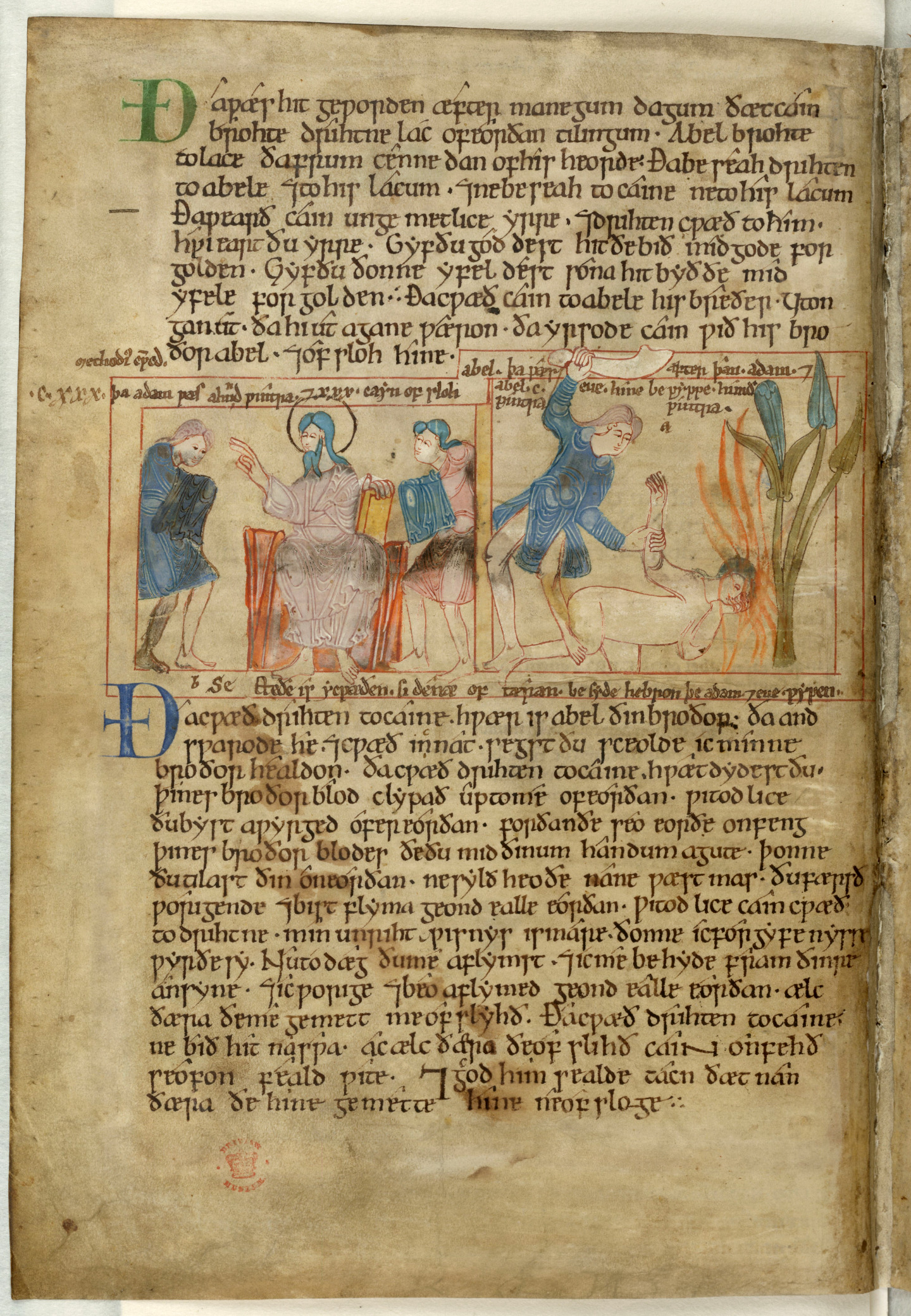 Also known as Aelfric’s Paraphrase of the Hexateuch, the piece was created in the Benedictine abbey of Saint Augustine in Canterbury; the Old English text was written around the second quarter of the eleventh century (1026–50), although Britannica says Aelfric flourished ca. 955–1025. The images must have appeared at approximately the same time as the text. The one presented here is considered to be the earliest known picture of the jawbone in Cain’s hand and “since the date of the prose Dialogue of Solomon and Saturn is unknown beyond the assumption that it is pre-1100, the illustration [in the Old English Hexateuch] may be as old as, or even older than, the first literary allusion.” (Henderson)