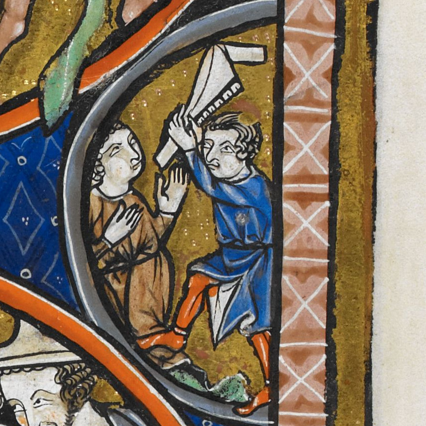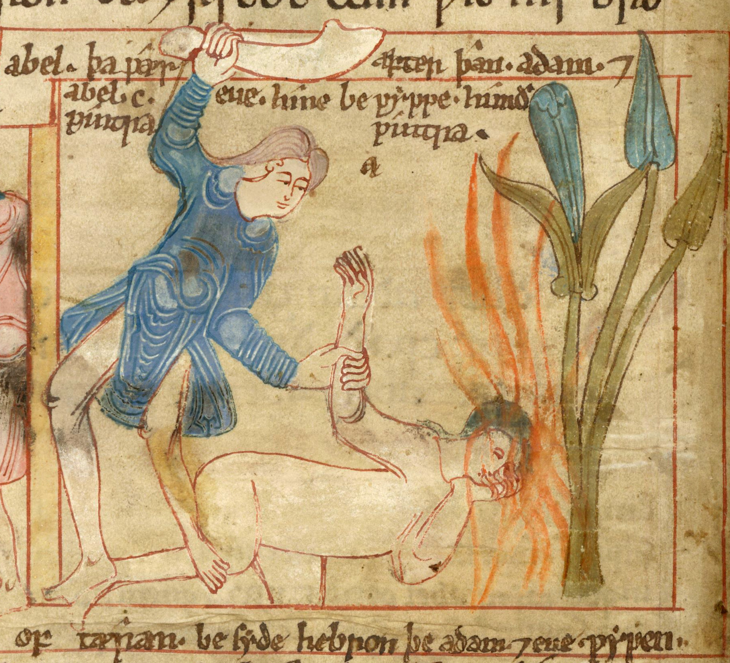 “The asymmetrically dented, thickened end of the curved club in Cain’s hand may be a vestigial trace of a jaw-bone in the model. Other miniatures in the same manuscript show English types—the Hell Mouth, the Ascension with only the legs of Christ visible, etc.” (Shapiro) — only because of this remark by Shapiro I include the picture, but indeed the jawbone is hardly recognisable in it.
