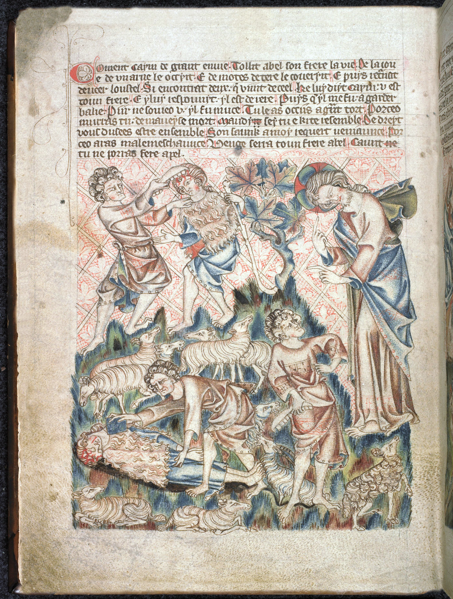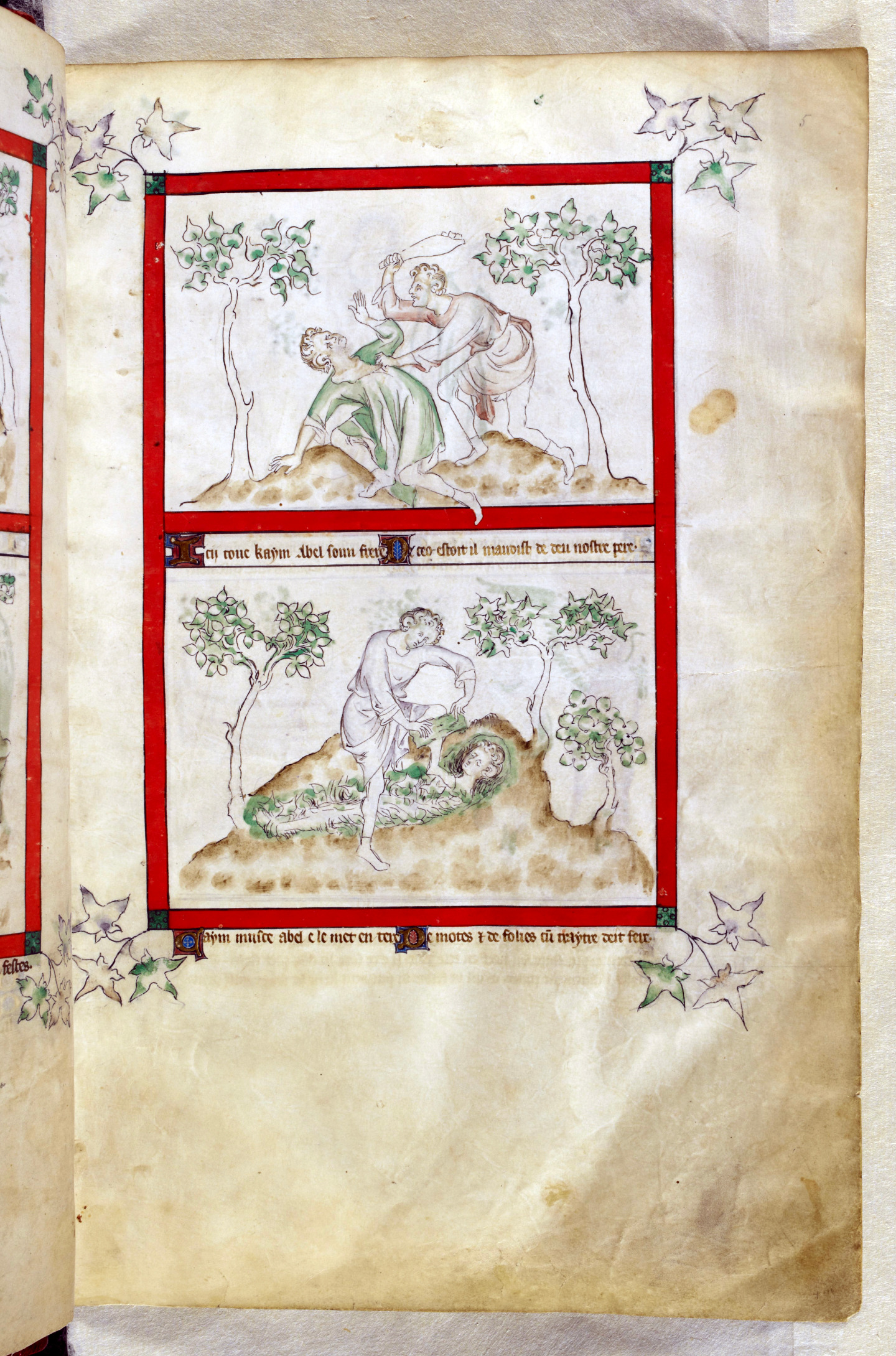 Scene caption in Anglo-Norman French says Ci tue Cain Abel sun frere par enuie.