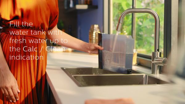 Вылейте целую бутылку средства для удаления накипи Philips в резервуар для воды, а затем долейте воды до отметки Calc / Clean . Установите резервуар на место . Установите большую емкость (1,5 л) под носик подачи кофе и воды . Нажмите кнопку запуска/остановки, чтобы начать процесс . . .