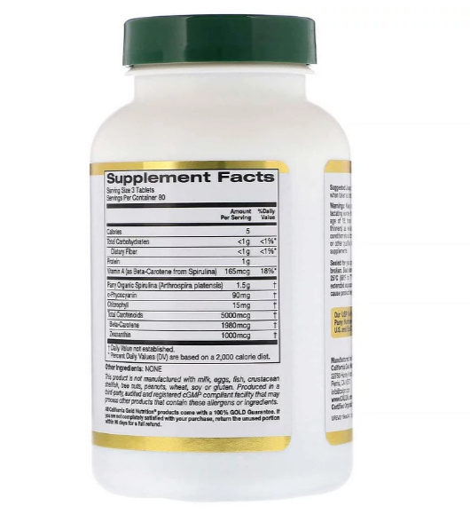 Известная американская компания по производству продуктов для здоровья California Gold Nutrition выпускает товары высокого качества . Биодобавка от этой компании содержит в составе много компонентов . Витамин А - 165 мкг на три таблетки Содержится в форме бета - каротина, полученного из спирулины, оказывает благотворное влияние на организм: