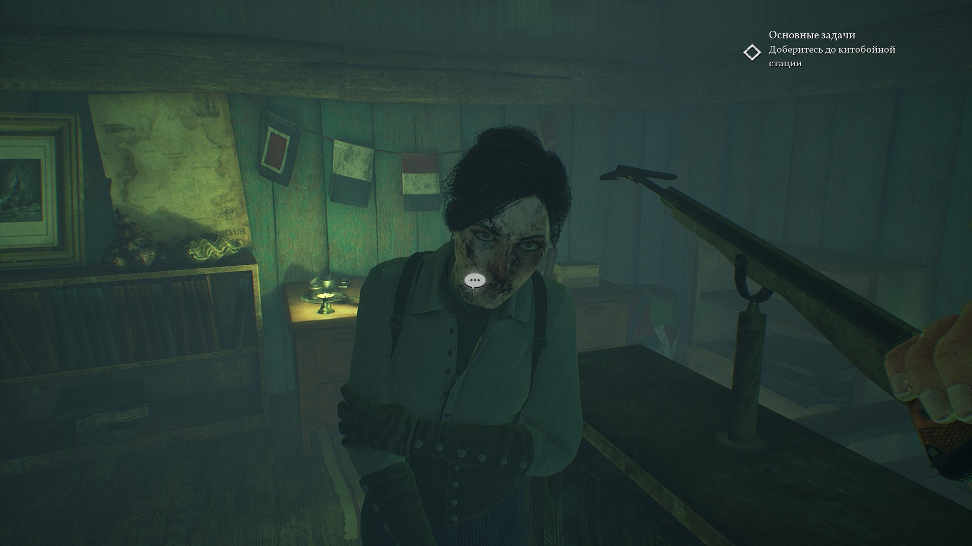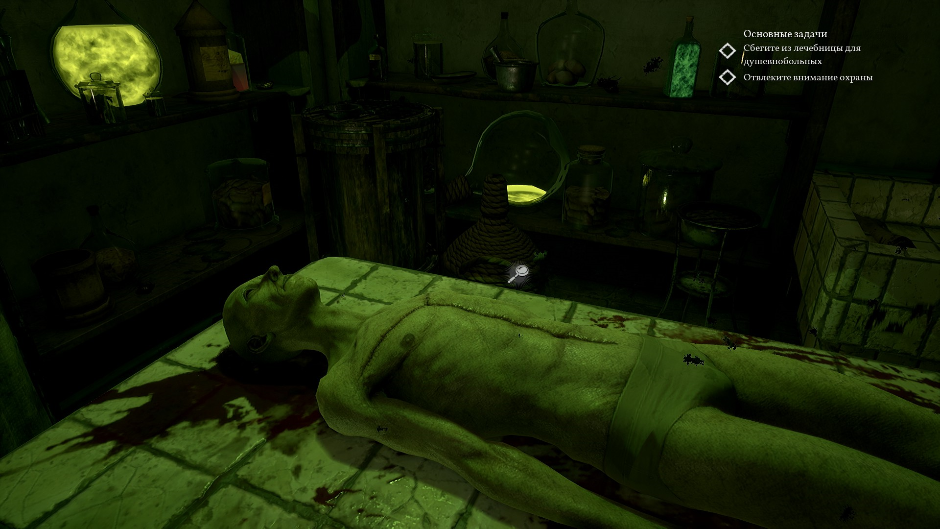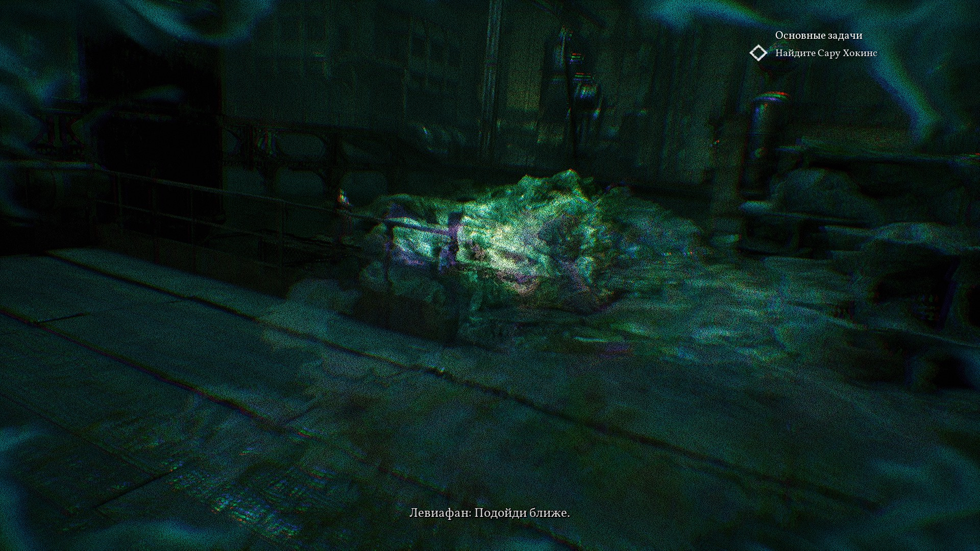 В самом помещении находим Левиафана в состоянии Шредингера. Его мертвые части отрезали и ели, а также делали с них определенную зеленую жижу.