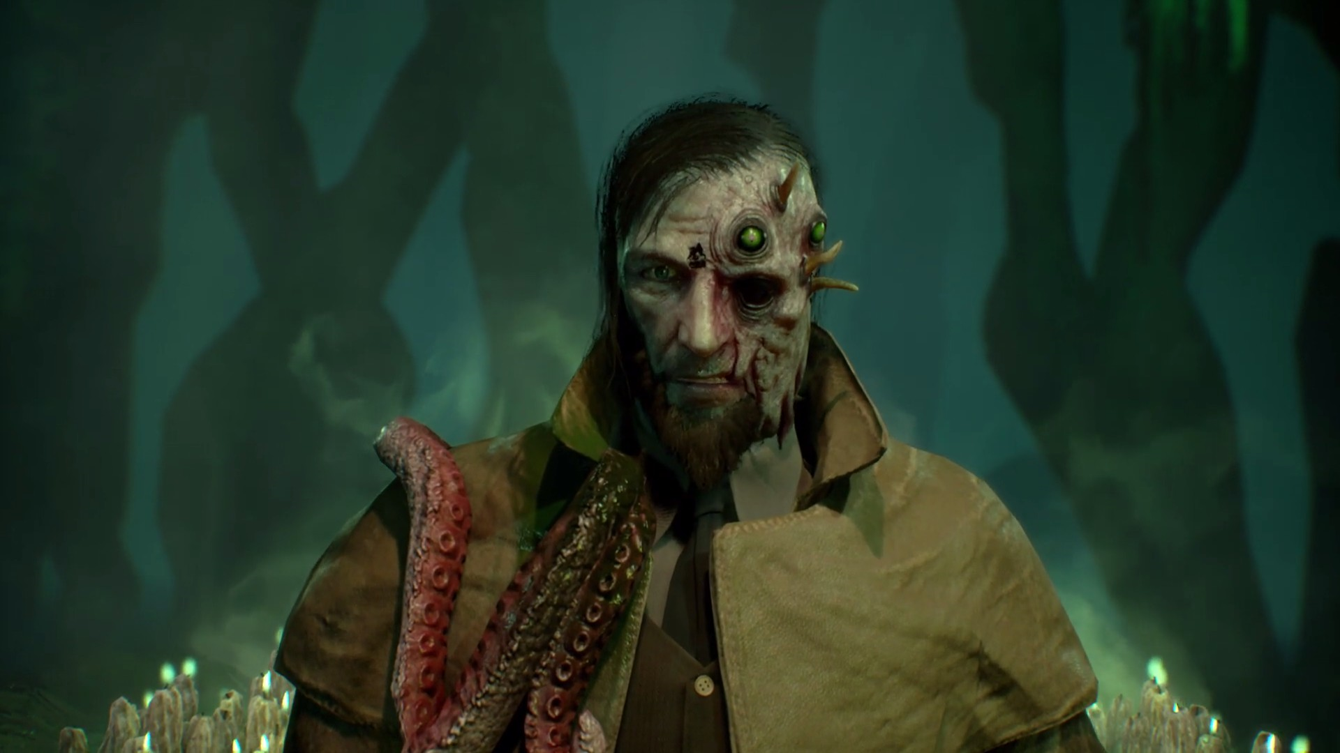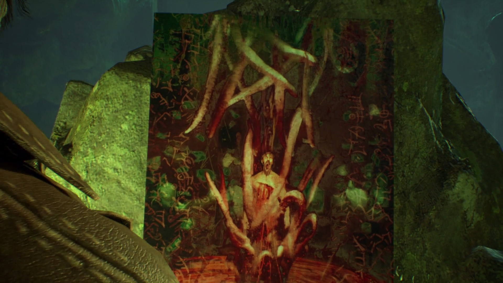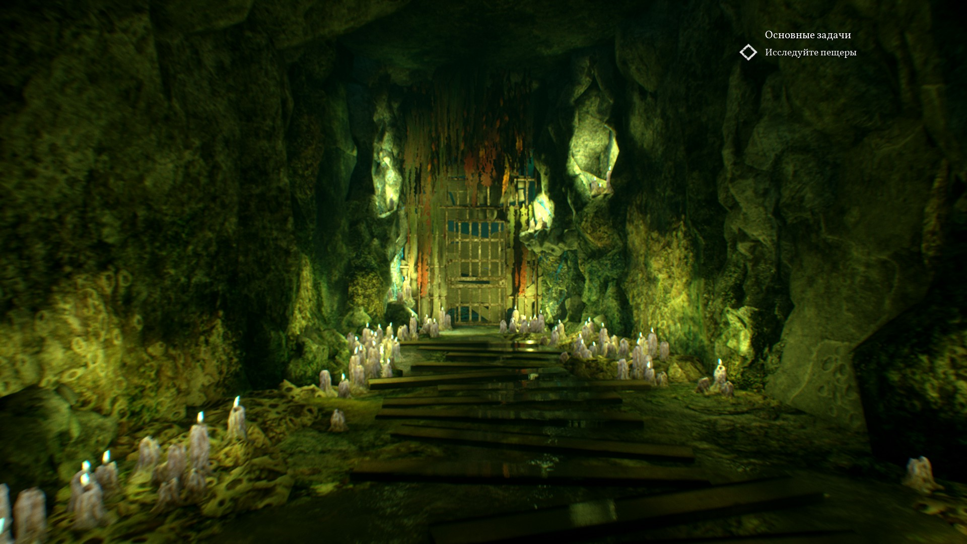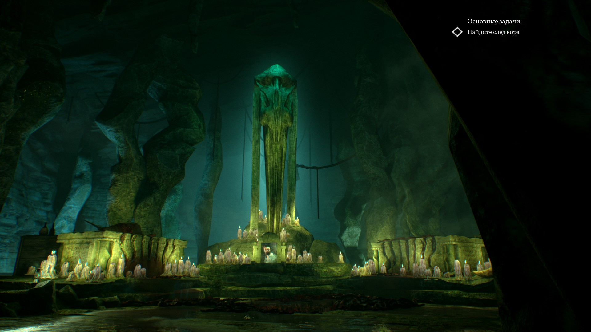 В пещере во всю разогревается атмосфера Ктулху. Стоят много статуй и памятников с щупальцами, вокруг непонятные зеленые свечи, а также зеленая жидкость.