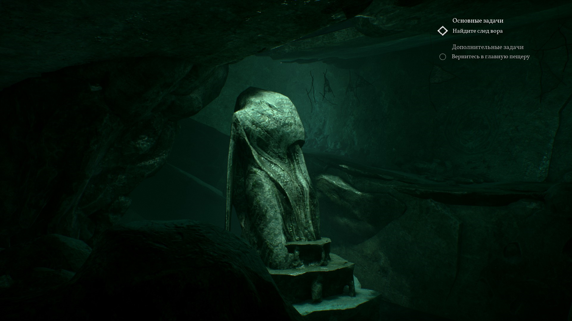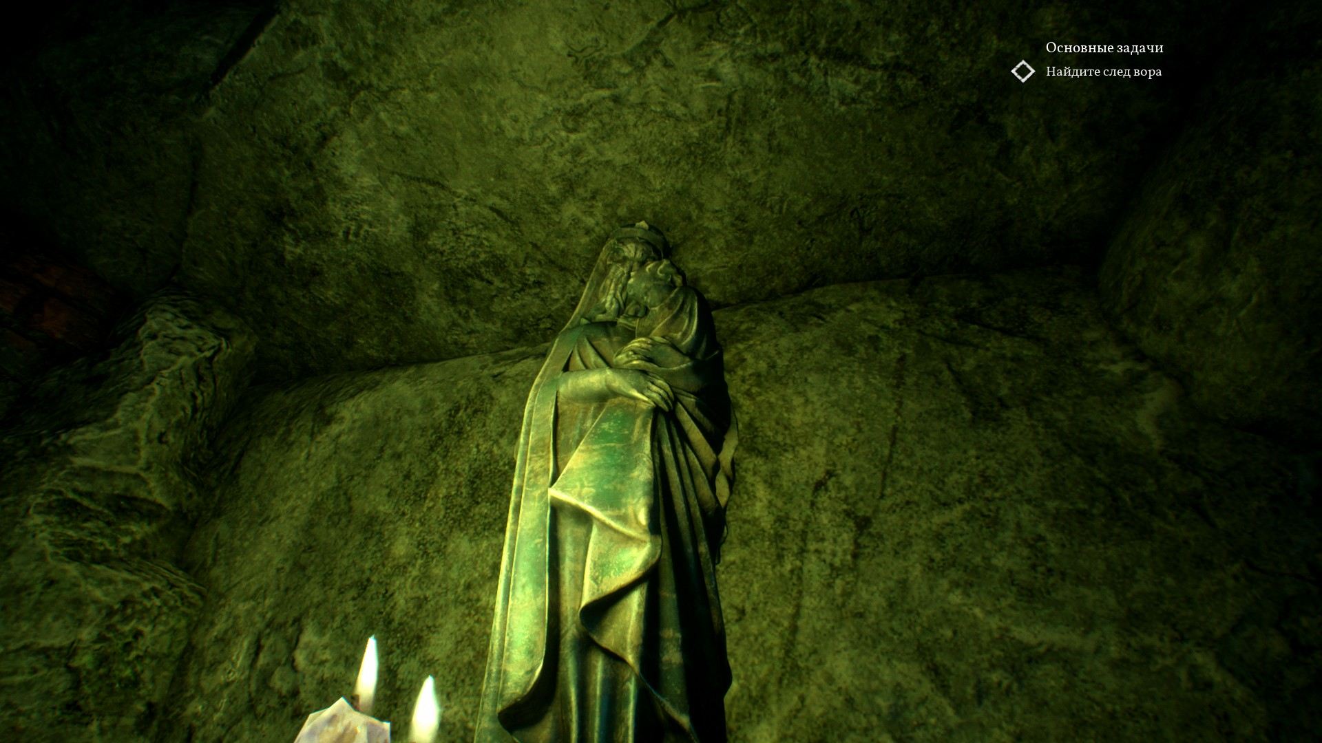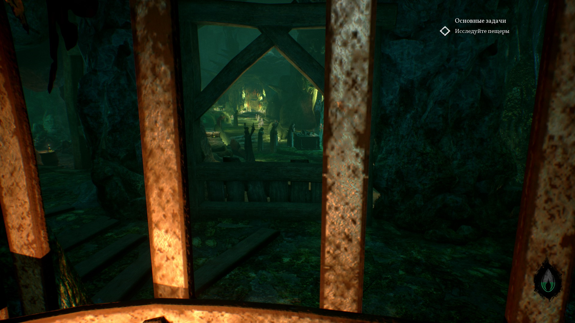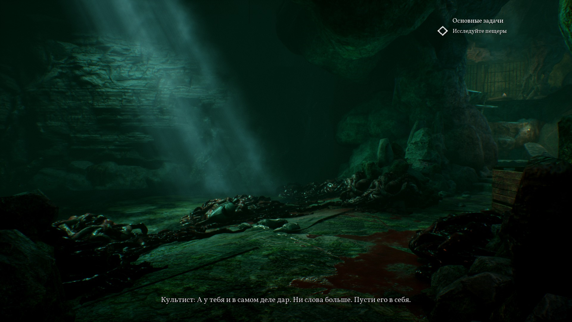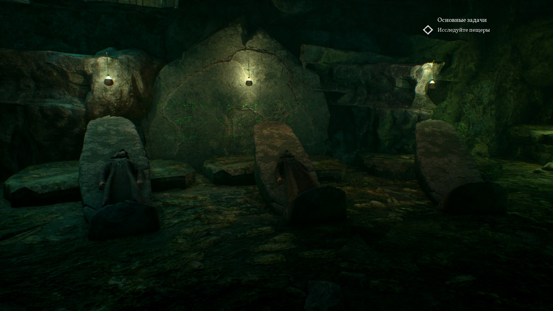 В пещере во всю разогревается атмосфера Ктулху. Стоят много статуй и памятников с щупальцами, вокруг непонятные зеленые свечи, а также зеленая жидкость.