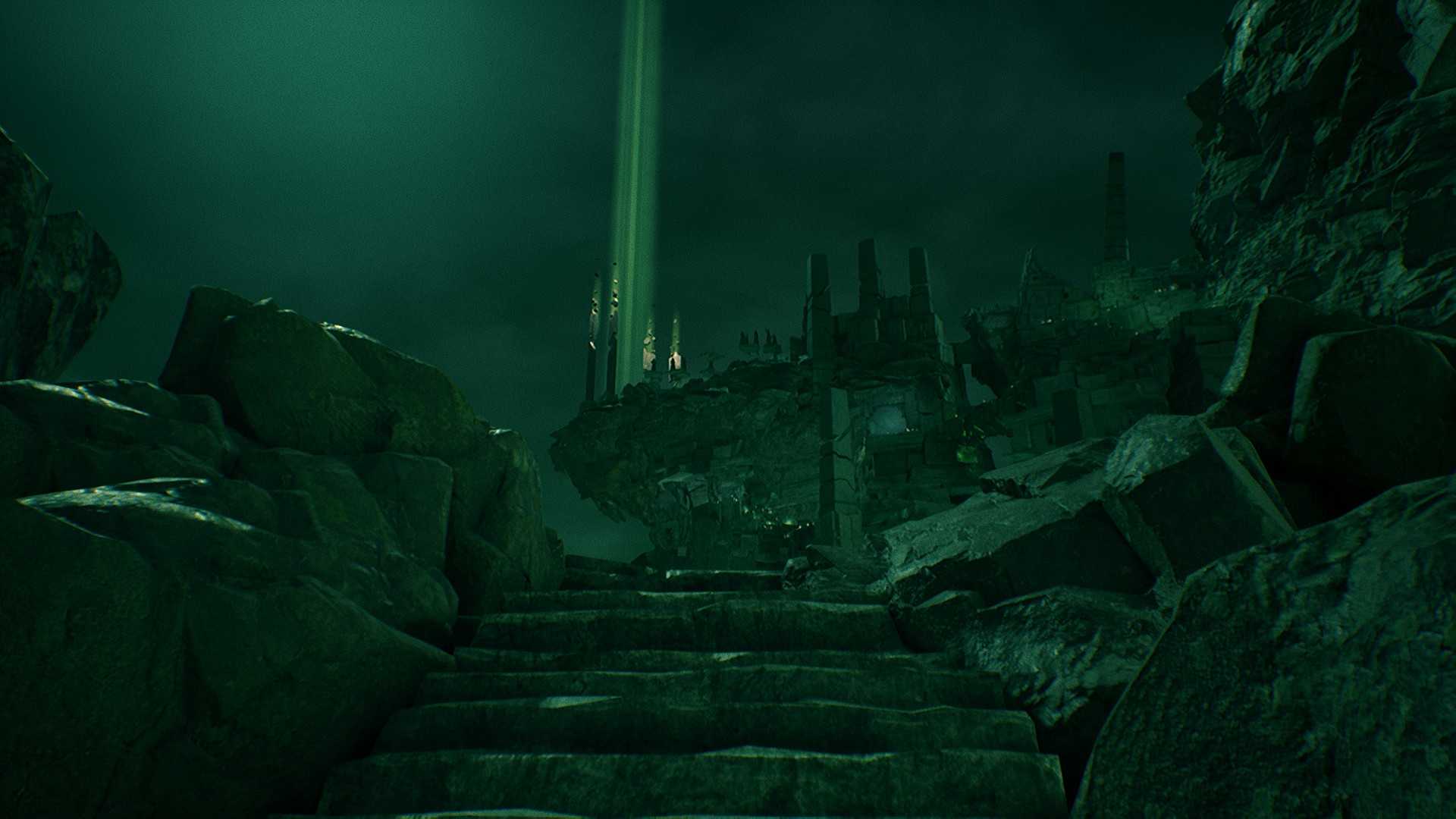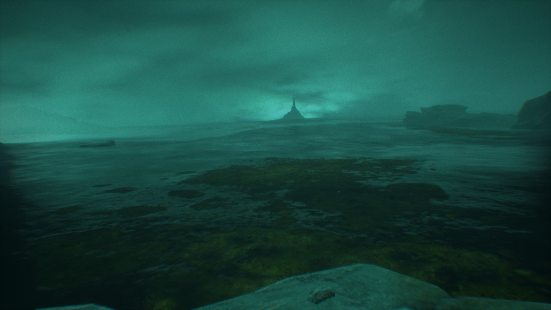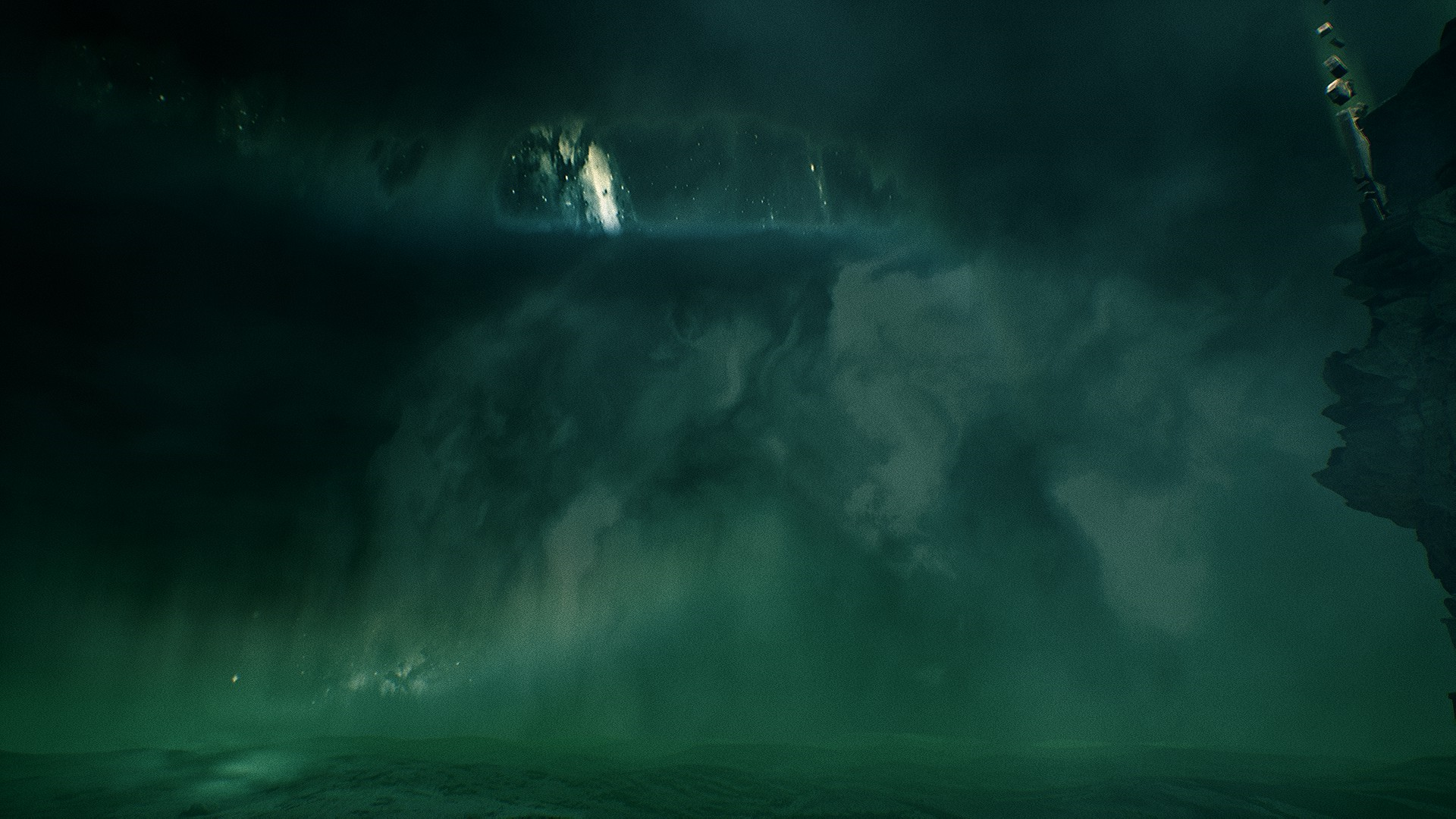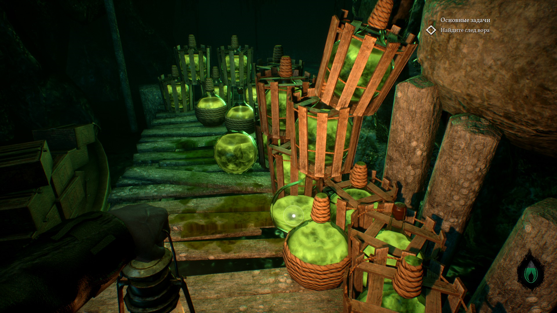 В пещере во всю разогревается атмосфера Ктулху. Стоят много статуй и памятников с щупальцами, вокруг непонятные зеленые свечи, а также зеленая жидкость.