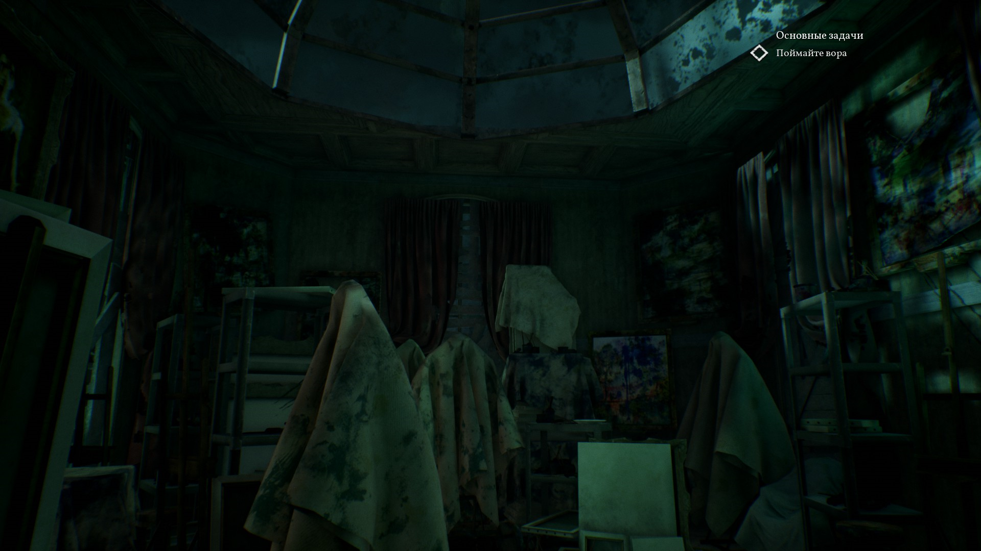 В этой комнате все заляпано красками, стоят множество мольбертов и холстов. Внезапно, некий человек выбегает с комнаты, причем не забыв с собой картину и нам нужно быстро найти и догнать вора.