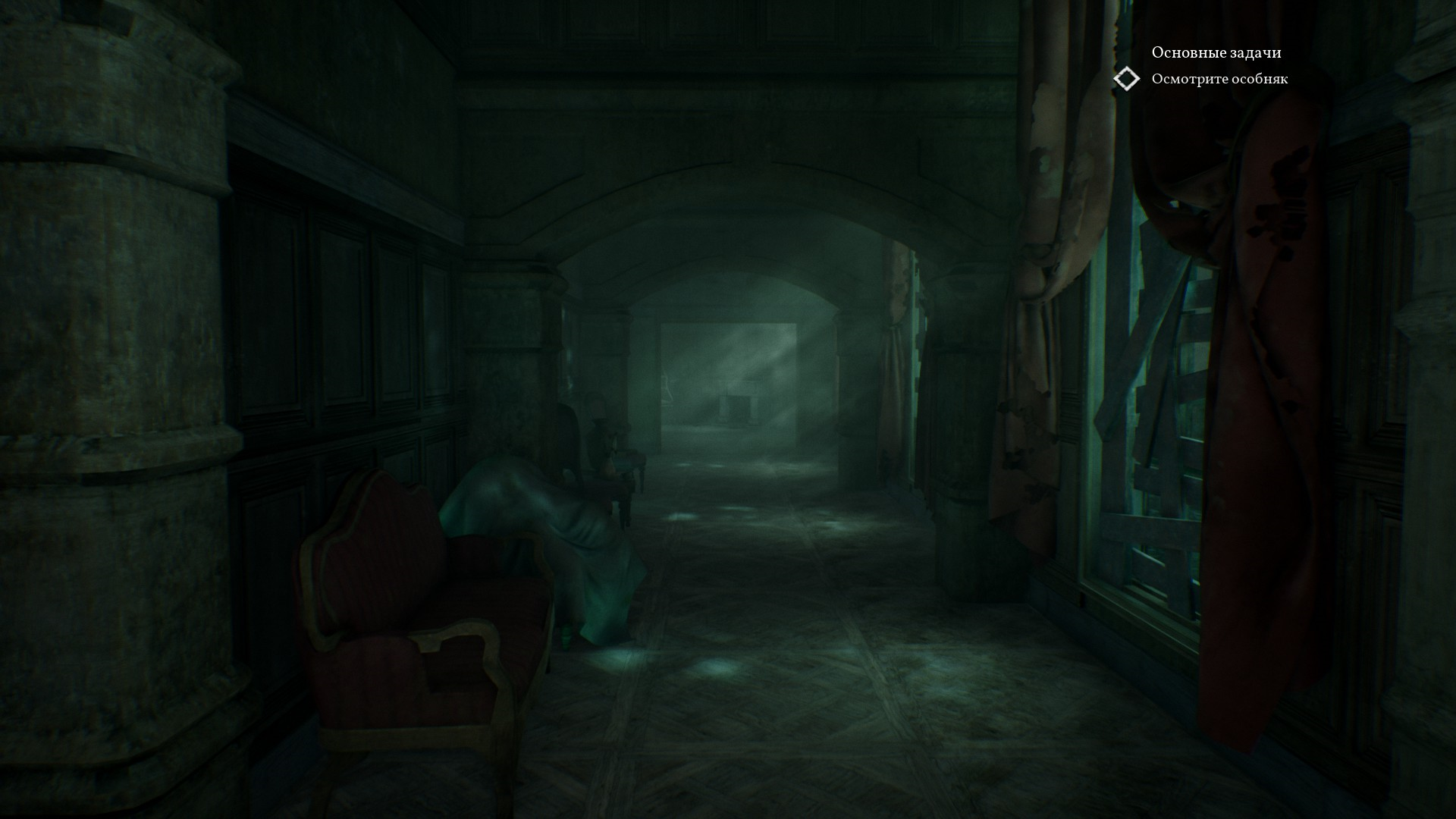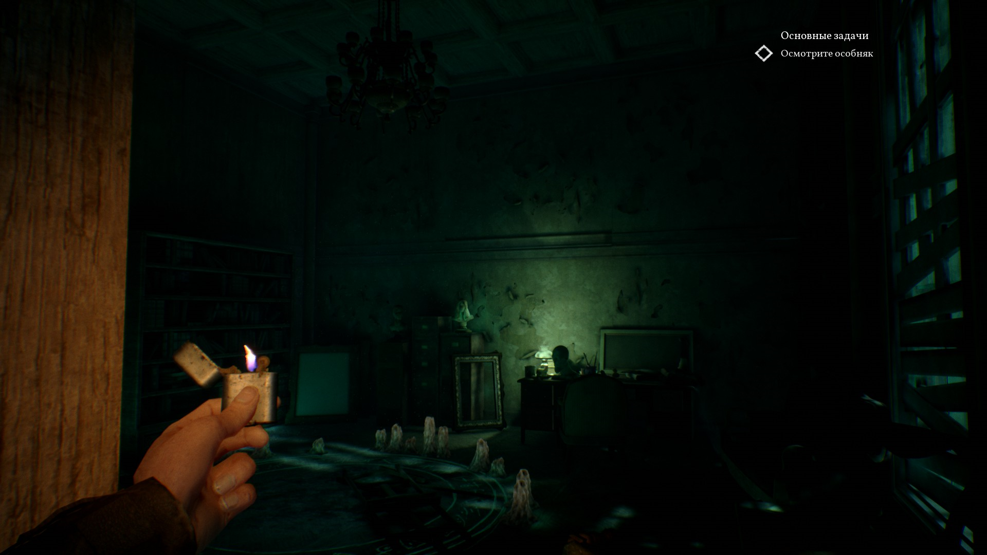 Дом являет собой мрачный особняк, наполненный токсическим, мистическим цветом, с множеством картин и заколоченными окнами. Можно узнать поближе Хокинсов, если читать различные записки и книги, а также заходя в разные комнаты, порой даже закрытые (благо нам помогает скилл расследования, который увеличивает шанс взлома двери).