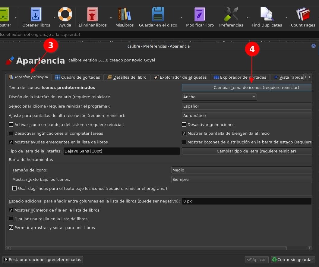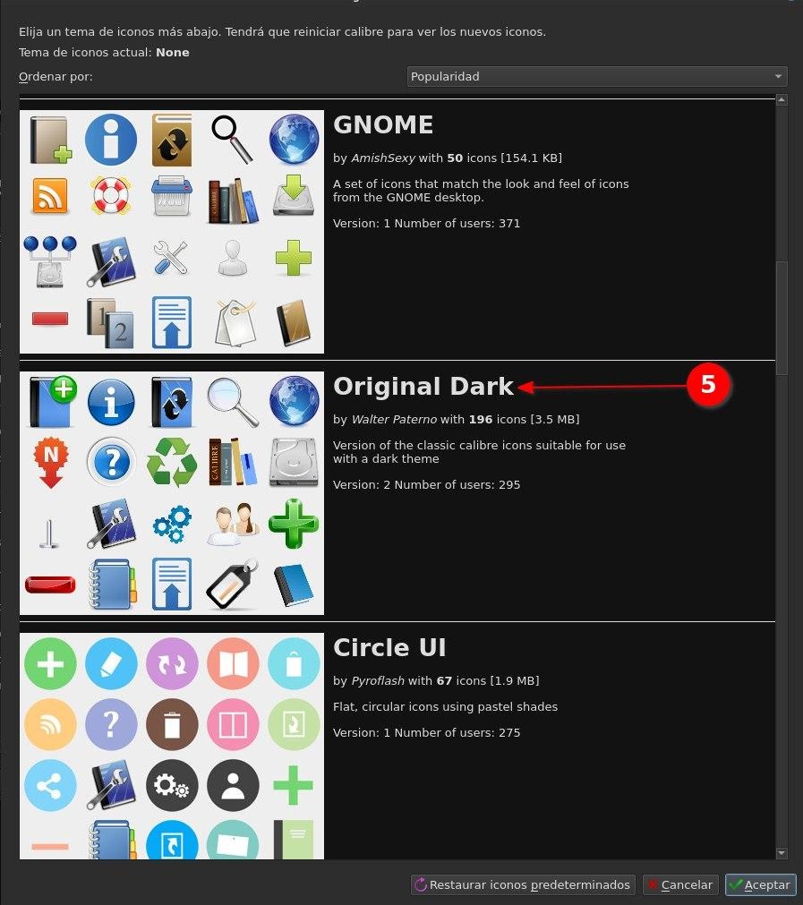 Le damos en aplicar y se reiniciara Calibre con el paquete de iconos seleccionado