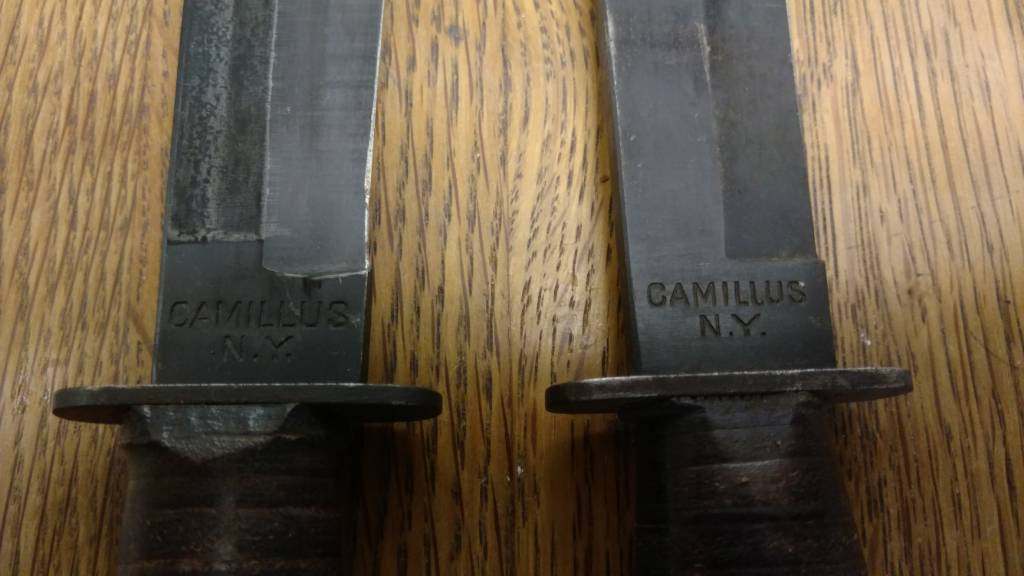 I have 2 Camillus Knives that are similar but different . Hoping to try and date them but I am finding conflicting information . Hoping you guys can help . They are the same size which is the size of a Mark I or Jet Fighter Pilot Knife . Both have dark what I believe is blued blades . Both marked CAMI . . .