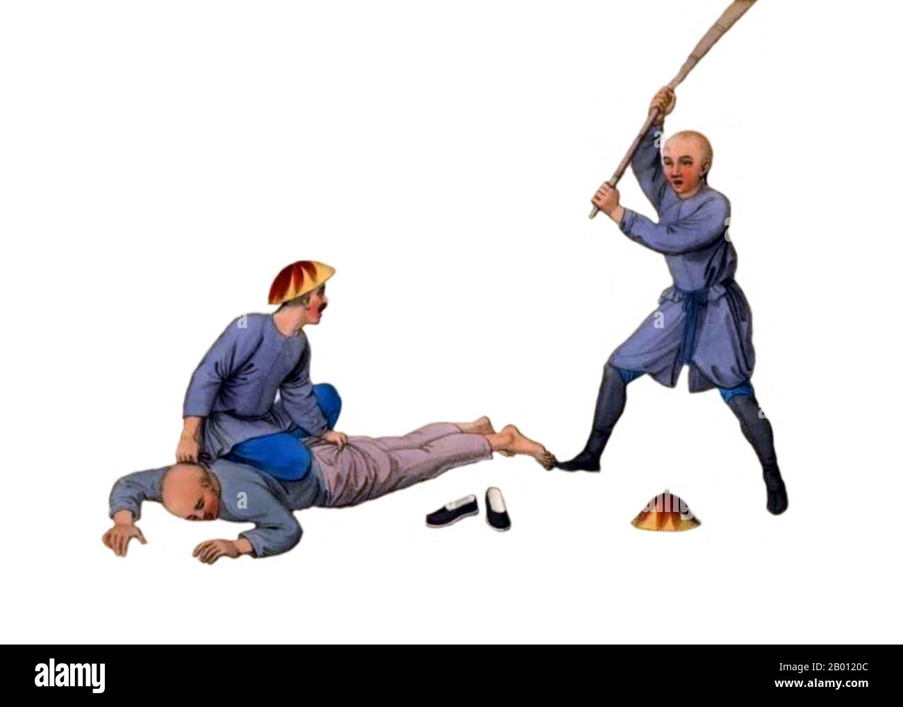 When all is ready, another officer, standing at the wall to the right of the frame, shouts out "Punishment of X strokes of the cane", and then calls out the number of each stroke before it is inflicted, just as described in the account by Robert Symes . As also in his description, the session takes place in an open-air compound .