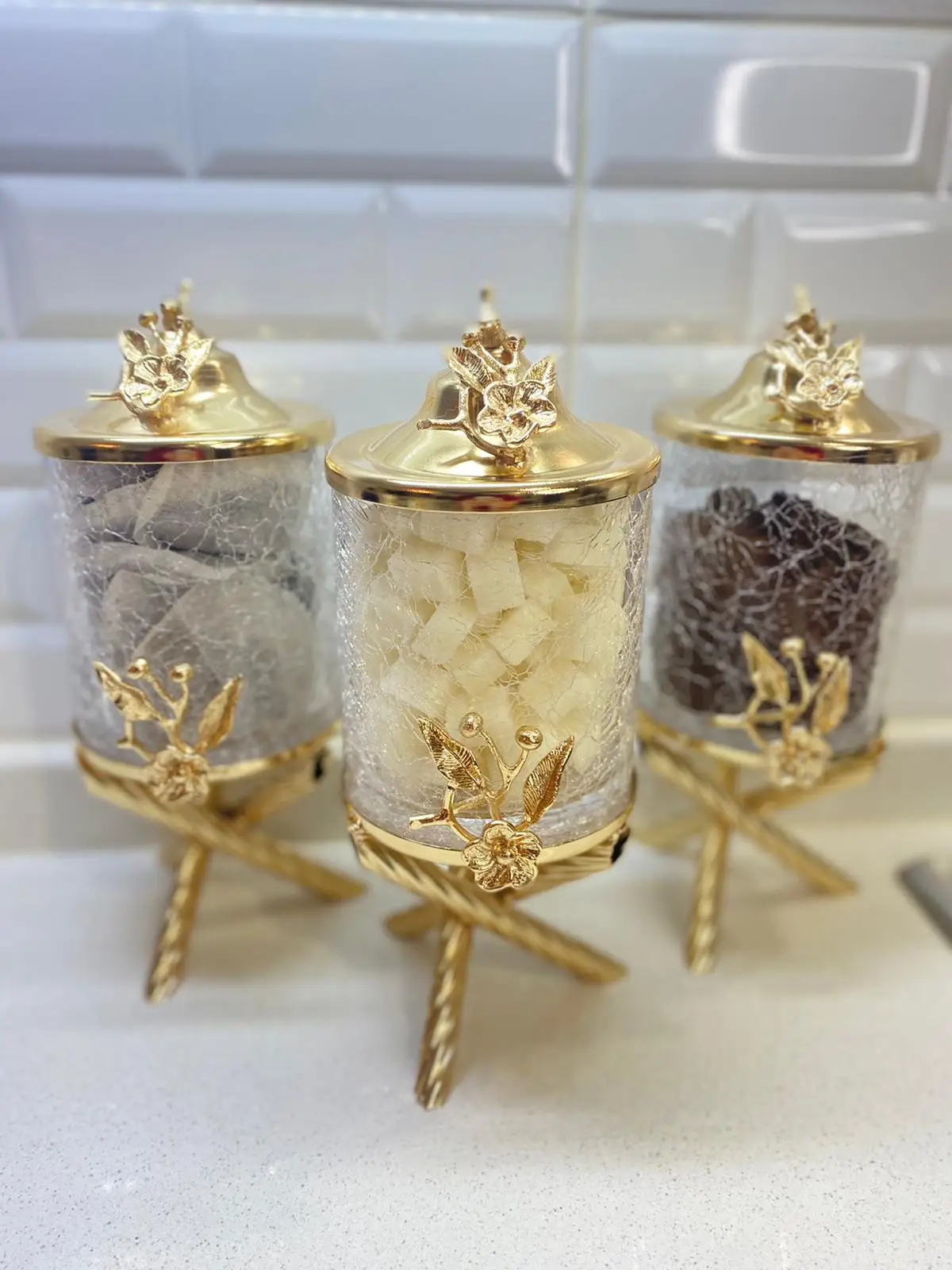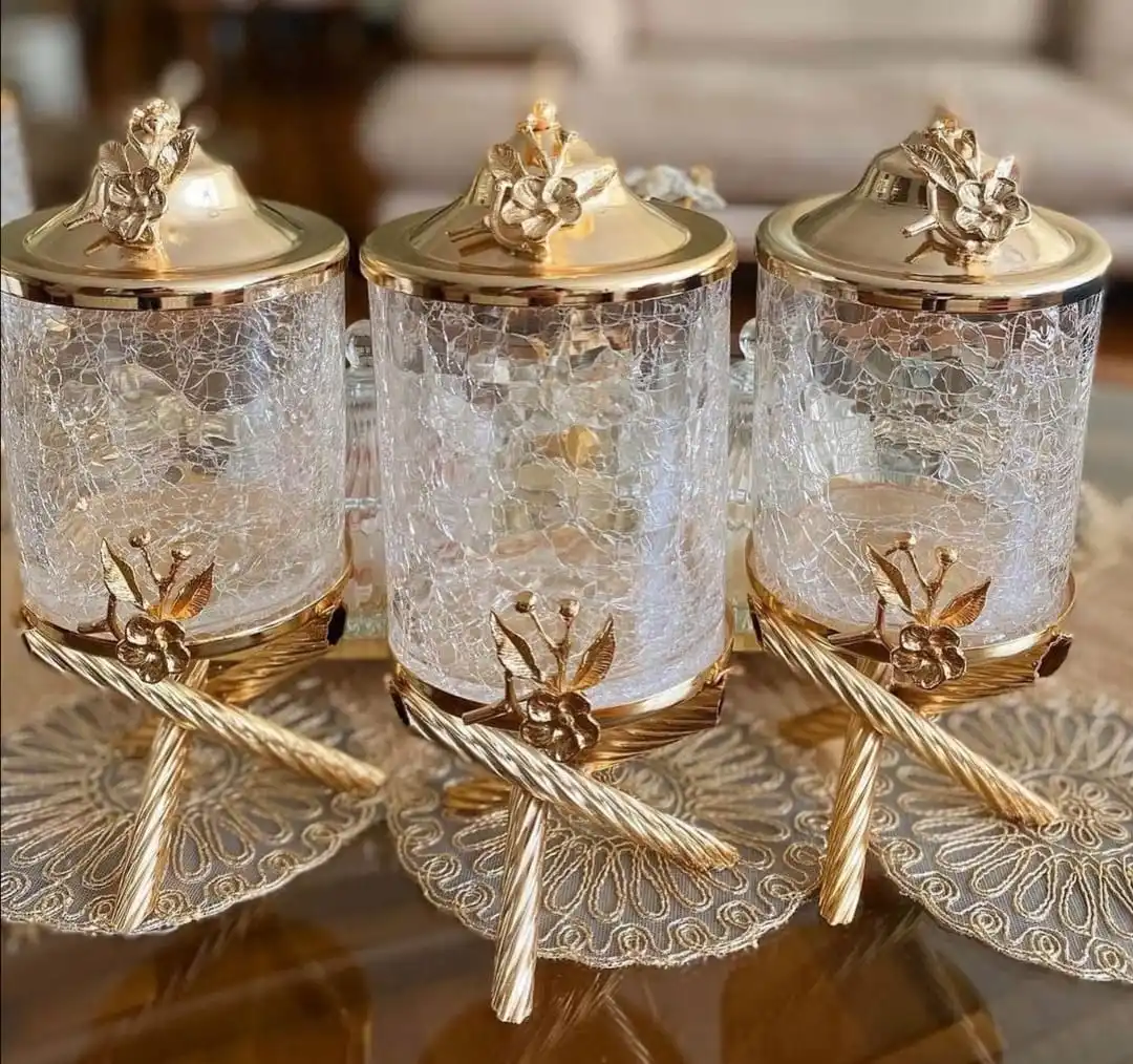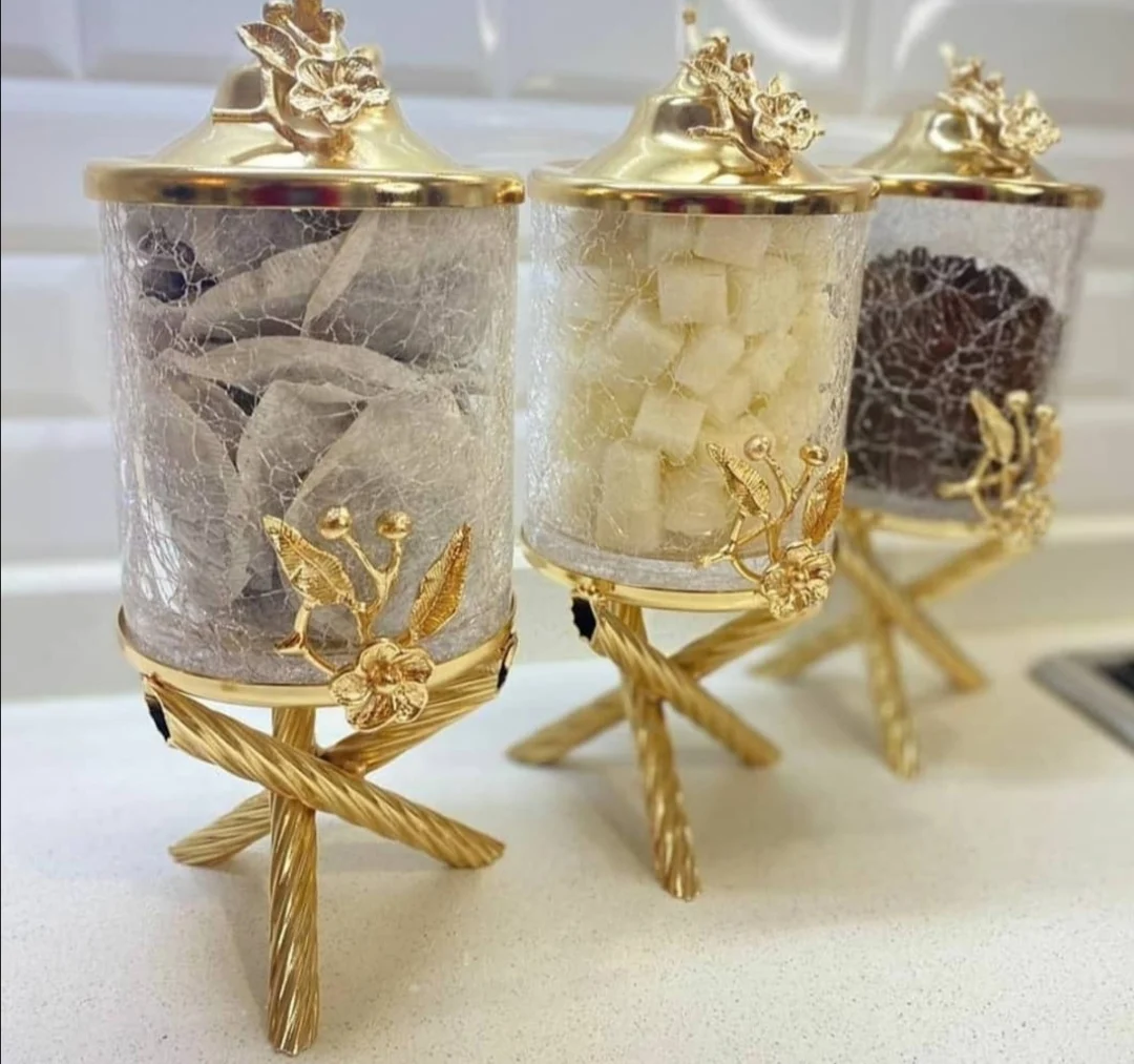 Canister Set For Kitchen 3 Piece Glass Stand High Workmanship Metal Tea Sugar Salt Storage Container Durable Sturdy Production Original Designs Artistic Kitchenware Gift Gold Color Transparent Erasable Quality Table - Купить с бесплатной доставкой