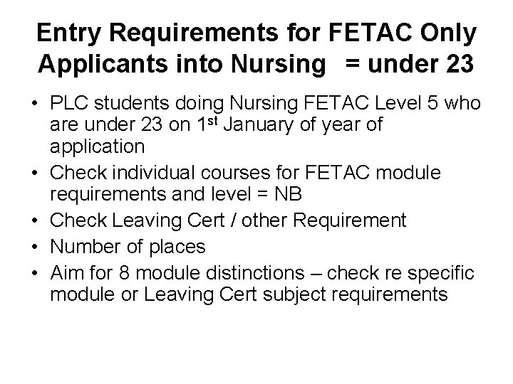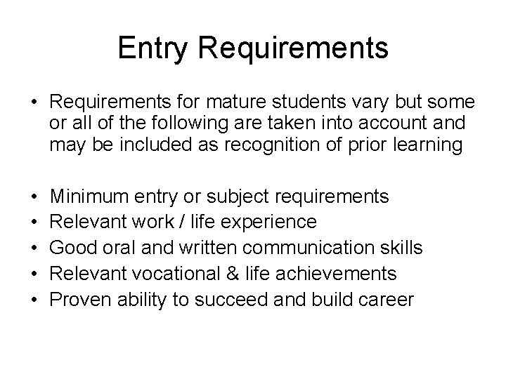A Mature Applicant is normally 23 years old on or before 1st of January of the year of admission . What are the entry requirements for mature applicants?