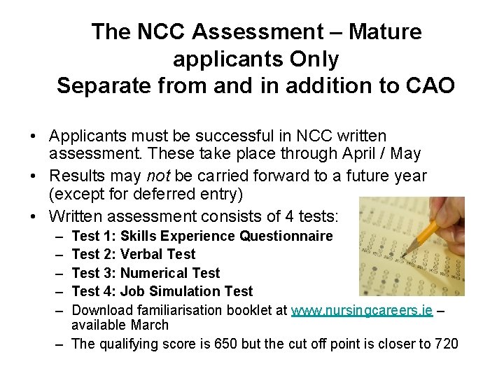 Mature students who successfully apply for nursing/midwifery through the CAO will be eligible to sit an assessment test in April .