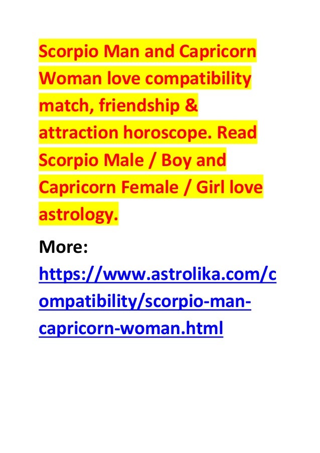 Scorpio Man and Capricorn Woman The Capricorn woman and Scorpio man will sense they are a perfect love match before their first date! The connection is deep and enduring . The Capricorn woman revels in her Scorpio man's magnetism . She senses his importance and power and is greatly attracted to it .