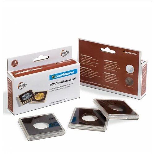 diamètre autorisé des pièces 29 mm hauteur autorisée des pièces 3,3 mm dimensions extérieures de la capsule 50x50x6,25 mm la capsule se ferme en toute sécurité et s'ouvre facilement protection garantie des pièces contre le ternissement jusqu'à 15 ans large gamme de possibilités de stockage : cassettes, tablettes, boîtes, feuilles d'albumQUADRUM Intercept représente une toute nouvelle technologie pour les pièces de collection ! La technologie brevetée d'Intercept a plus de 30 ans et est basée sur un insert en mousse spécial dans la capsule QUADRUM. Les particules de cuivre contenues dans le matériau lient constamment les gaz agressifs et neutralisent ainsi les substances atmosphériques nocives à l'intérieur de la capsule. Cela protège les pièces du ternissement. L'effet a été testé selon les normes DIN, EN, ISO et ASTM. Lors de l'utilisation des capsules, le potentiel du matériau est épuisé et l'insert en mousse change de couleur du gris foncé au vert. Lorsqu'une telle décoloration se produit, la capsule doit être remplacée par une nouvelle.