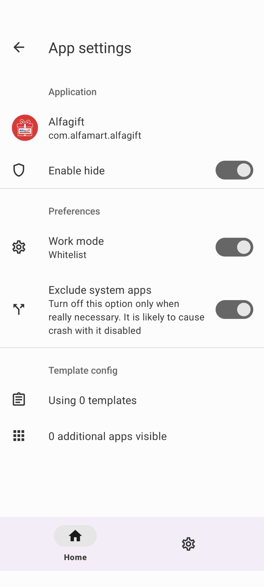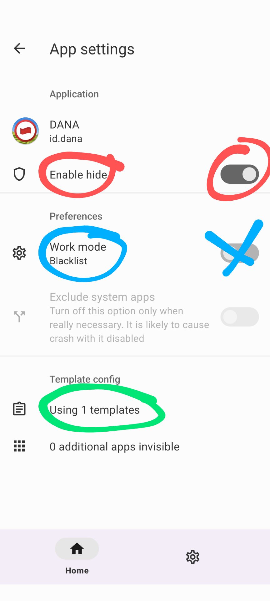 - Lalu pilih aplikasi yang ingin di-hide, seperti aplikasi perbankan. Hidupkan opsi "Enable hide", pilih "work mode" sebagai blacklist, dan masukkan template yang sudah di buat sebelumnya.