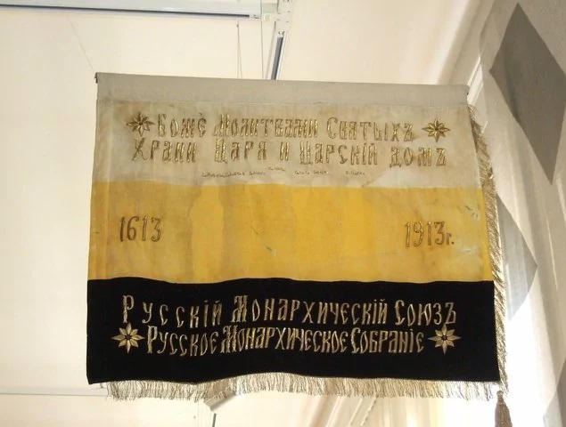 Последний флаг Российской Империи . Бело-сине-красный с черным двуглавым орлом на золотом поле в левом верхнем углу, представлявший собой олицетворение лозунга "Единение Царя с народом" .
