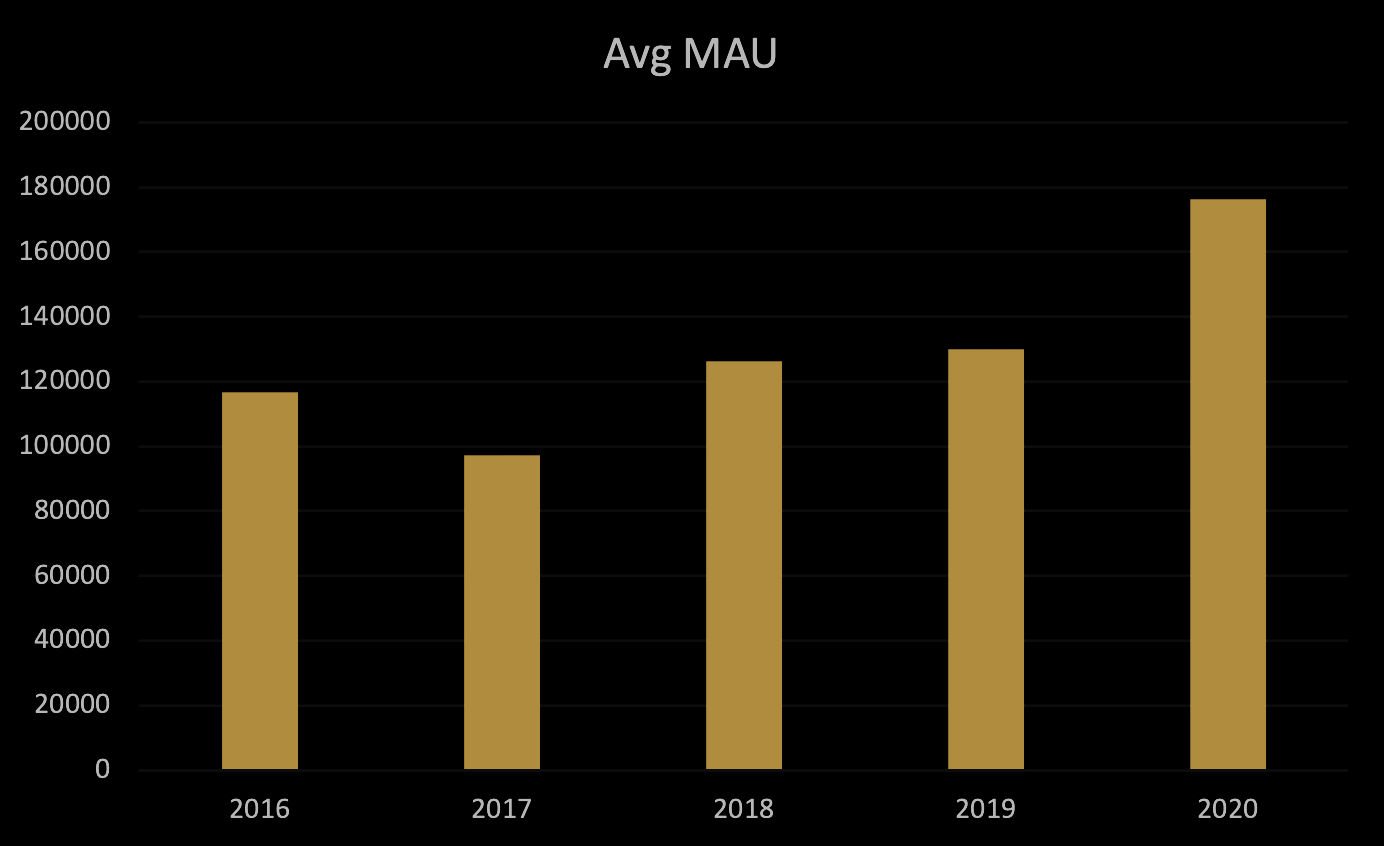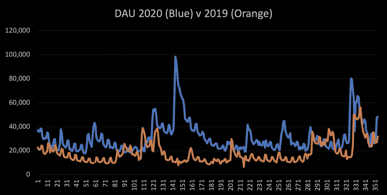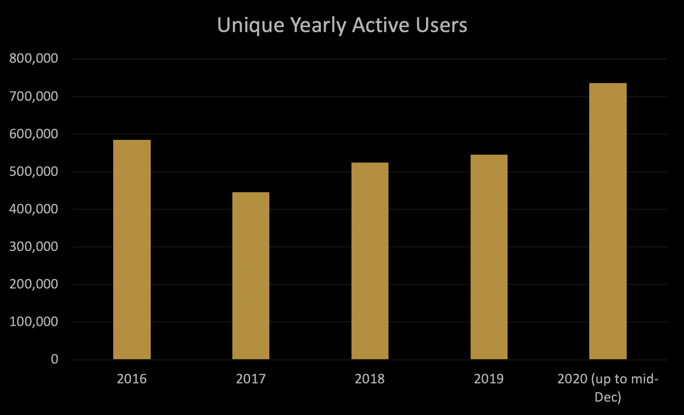 Más allá de registrar nuestros mejores números de crecimiento de nuevos jugadores, en términos de participación diaria hemos continuado con un promedio de 30 mil Usuarios Activos Diarios a lo largo del año, lo cual es un aumento del 70% con respecto al año pasado. Y nuestro MAU (usuarios activos mensuales) es aproximadamente 35-40% más alto que en 2019 y 2018. Durante todo el año (teniendo en cuenta que aún nos quedan 10 de los días más activos del año), el 2020 ha demostrado ser nuestro mayor año en términos de inicios de sesión únicos totales. Tuvimos más de 33 millones de sesiones de juego iniciadas por más de 740.000 jugadores únicos hasta ahora en 2020. Ese conteo de Jugadores Únicos es 35% y 40% más alto que en 2019 y 2018, respectivamente, y 25% más alto que nuestro récord anterior en 2016 (recién salido el Persistant Universe).