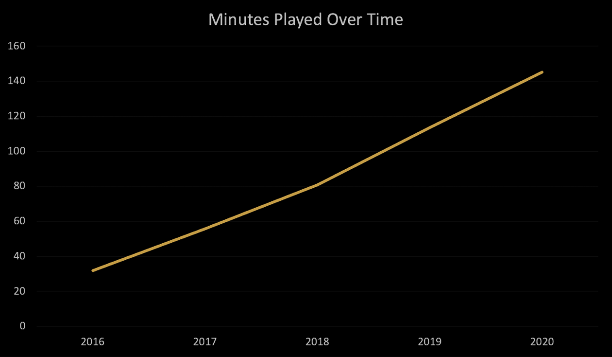 En 2016, recién lanzado la 2.0, los jugadores promediaban 32 minutos de juego por día. Ese número saltó a 56 minutos de promedio por día para 2017. En 2018, saltó de nuevo a 81 minutos por día. En 2019, ese promedio aumentó a 114 minutos jugados por día por jugador. Y ahora en 2020, nos encontramos con un promedio de tiempo de juego por jugador por día de 2 horas y 25 minutos.
