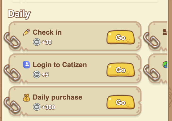 Задания находятся сверху во вкладке "!" Quests. Там есть задания, которые можно сделать только один раз, а есть и те, которые можно делать каждый день. Они очень простые и помогут вам фармить монеты FISH, так что рекомендуем их выполнять.