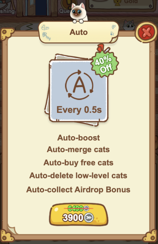 За донат вы можете купить себе AUTO, и на автомате получать скрещивание кошек и активацию бустов. С ним можно просто не выключать свой телефон ночью и продолжать прокачивать своих котов.