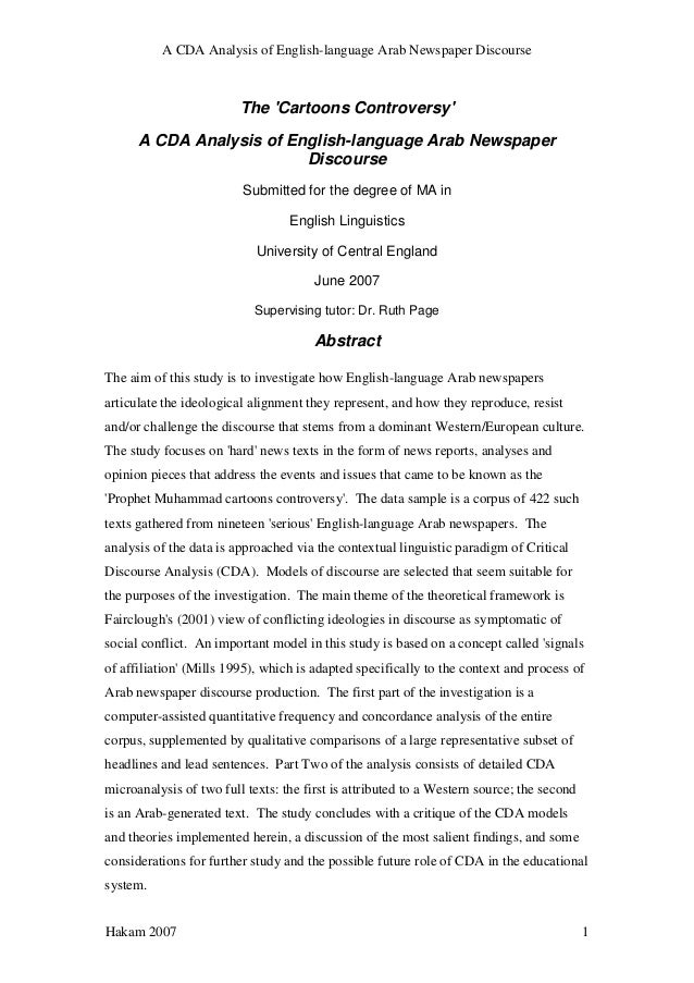 A dissertation submitted to the faculty of The University of Utah in partial fulfillment of the requirement for the degree of . . . Discourse Analysis ( CDA ) to examine how Islamists are represented in frontpage news reports in the Egyptian newspaper al-Ahram, in 2000 and 2005 . The analysis
