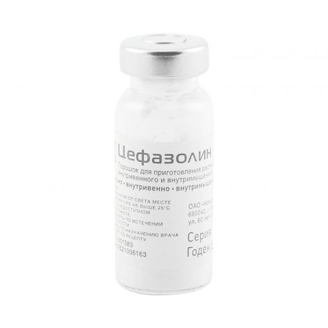 Активное вещество: цефазолин (cefazolin) Rec .INN зарегистрированное ВОЗ Лекарственные формы Форма выпуска, упаковка и состав препарата Цефазолин Порошок для приготовления раствора для в/в и в/м введения белого или почти белого цвета . Флаконы стеклянные (1) - коробки картонные .